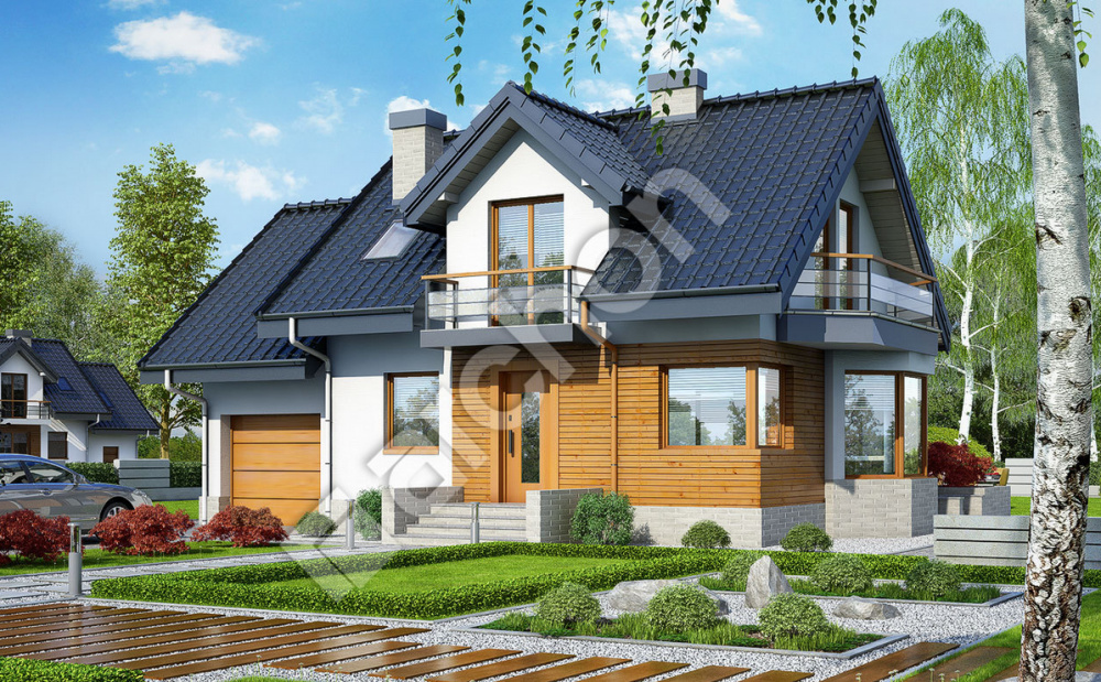 Budynek mieszkalny charakteryzuje się nowoczesną i ciekawą bryłą architektoniczną oraz funkcjonalną przestrzenią wewnętrzną. Oryginalną cechę domu stanowi przeszklony wykusz w części dziennej-jadalni. Na poddaszu domu przewidziano również 2 balkony.