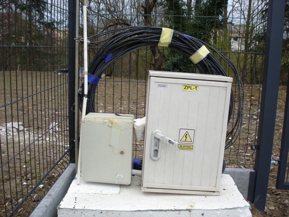 W skład zestawu wchodzi skrzynka elektryczna, przewód przyłączeniowy do słupa tzw. warkocz 4x16 (ok.30m), szpilka uziemienia, uchwyty do mocowania przewodu na słupie, słup drewniany 5,5m.
