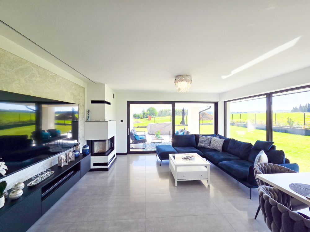 - Strefa dzienna to otwarta przestrzeń, w której kuchnia harmonijnie łączy się z jadalnią i salonem. Duże przeszklenia sprawiają, że wnętrze jest pełne naturalnego światła, a z salonu można wyjść bezpośrednio na zadaszony taras, idealne miejsce na rodzinne spotkania czy relaks po dniu pełnym obowiązków.