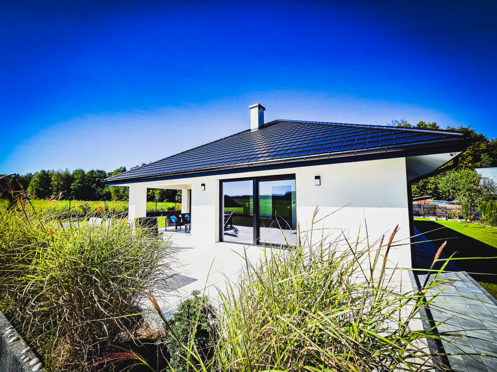 Budynek pokryty jest modułową dachówką blaszaną w kolorze czarnym (30-letnia gwarancja), a kominy z wkładami ceramicznymi połączono z systemem kominowym marki Dafro.