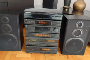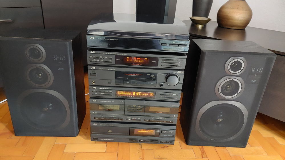 Wierza JVC z lat 80 w skład której wchodzi jednostka centralna - amplituner z eqalizerem oraz podwójnym magnetofonem DR-E53L BK ( moc 165 W ), oraz odtwarzacz płyt cd XL-E34, gramofon AL E21 i dwie kolumny głośnikowe SP E73 o mocy muzycznej 120W każda. Jeden z magnetofonów nie przewija kasety w jedną stronę gramofon natomiast ma problem z wystartowanie jak się go ruszy to startuje. Są to dr