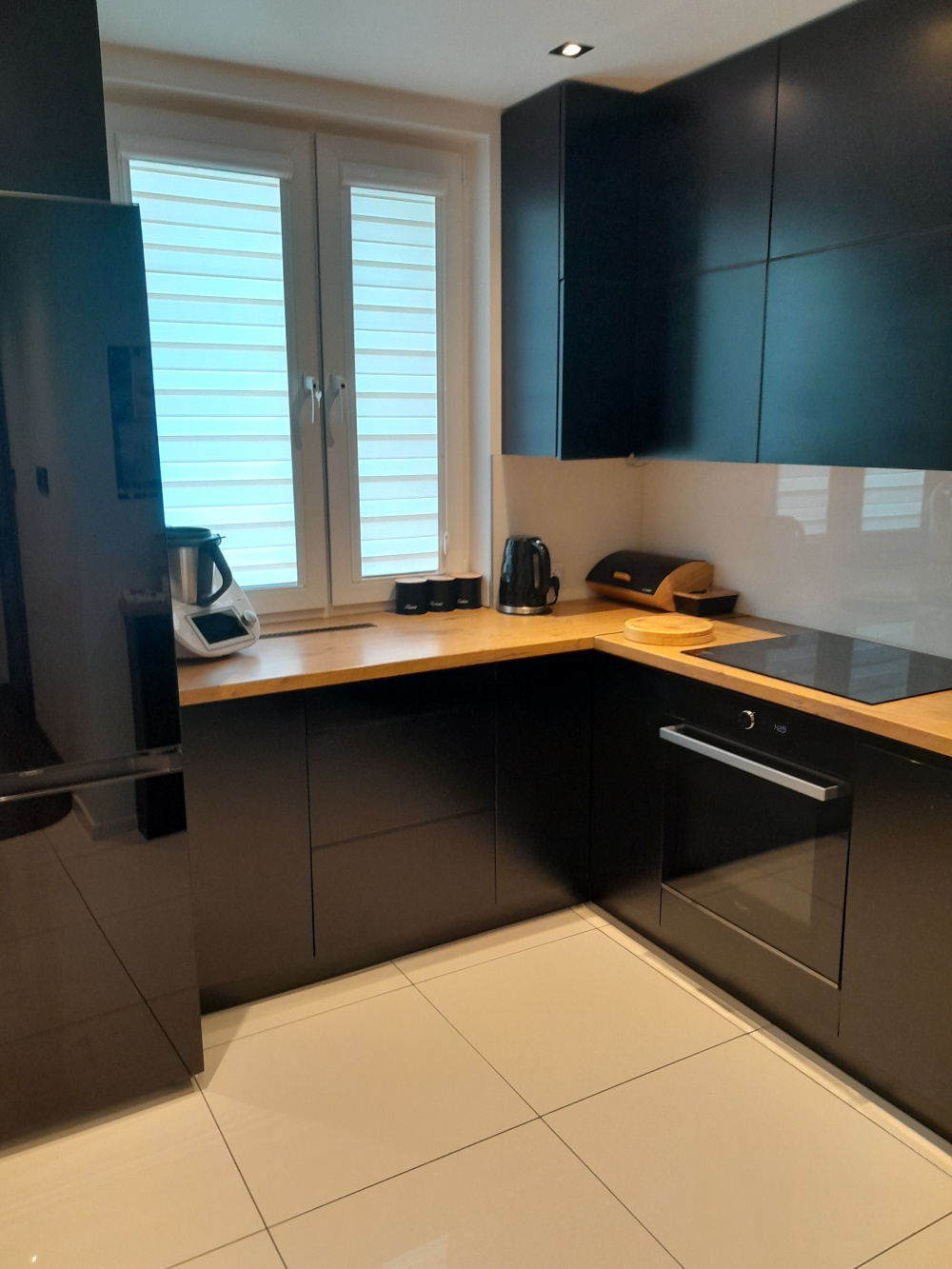 - kuchnia: wykonana na wymiar, zaprojektowana z dbałością o każdy detal oraz z myślą o funkcjonalności oraz estetyce