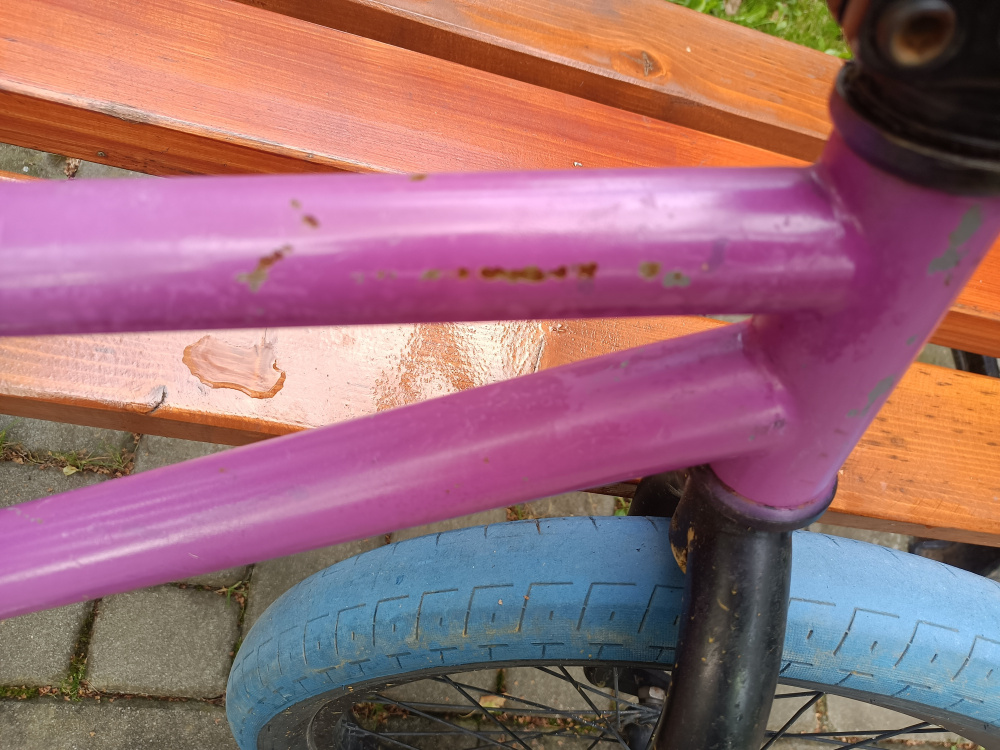 Rower posiada ramę pomalowaną na różowo i niebieskie opony, ma w niektórych miejscach rysy oraz rdzę lecz rysy i zadrapania to normalna