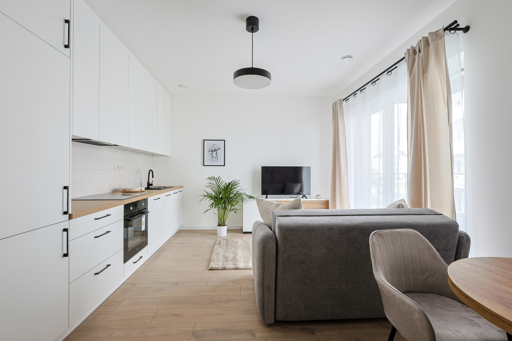 Na wynajem nowoczesna kawalerka (26 m²) w stylu Skandi w nowym bloku przy ulicy Hallera 19.