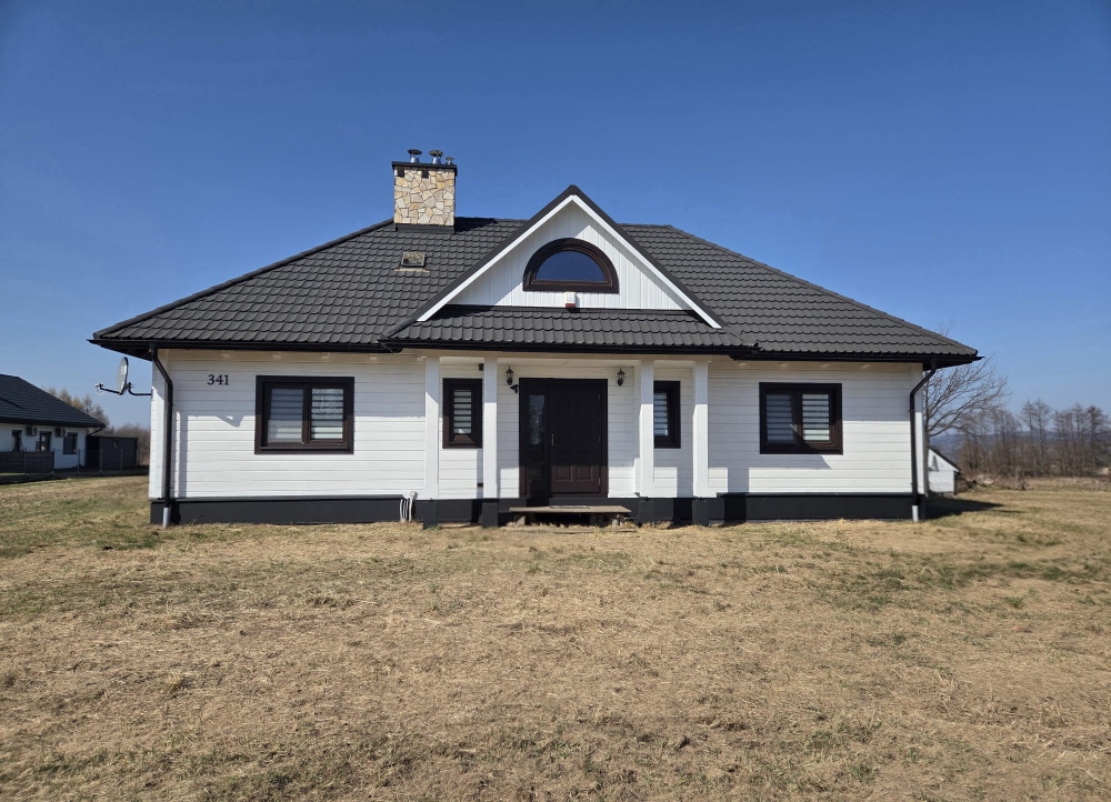 Mam do sprzedania solidny dom z bali wybudowany w 2014 roku. Dom jest w centralnej części widokowej działki o powierzchni 19,26 ar w miejscowości Ustrobna - 3 km od Krosna. Dom jest parterowy o powierzchni użytkowej 118,92 m2 i składa się z: kuchni otwartej na przestronny salon z kominkiem, 3 pokoi (w tym jeden posiada osobną garderobę a główna sypialnia ma szafę w zabudowie), łazienki, toalety, ... (pokaż całość)