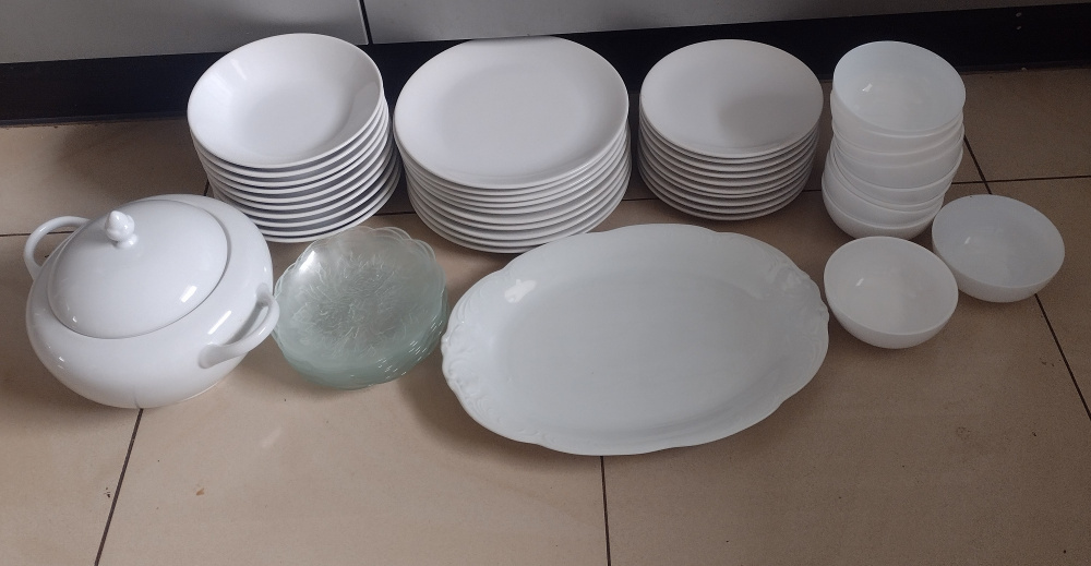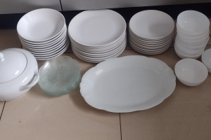 Sprzedam w bardzo dobrym stanie zestaw naczyń talerze 10 głębokich 10 dużych 10 małych 10 miseczek na lody 8 na ciastka taca plus waza. Gratis dodaje miske na sałatkę i sztućce