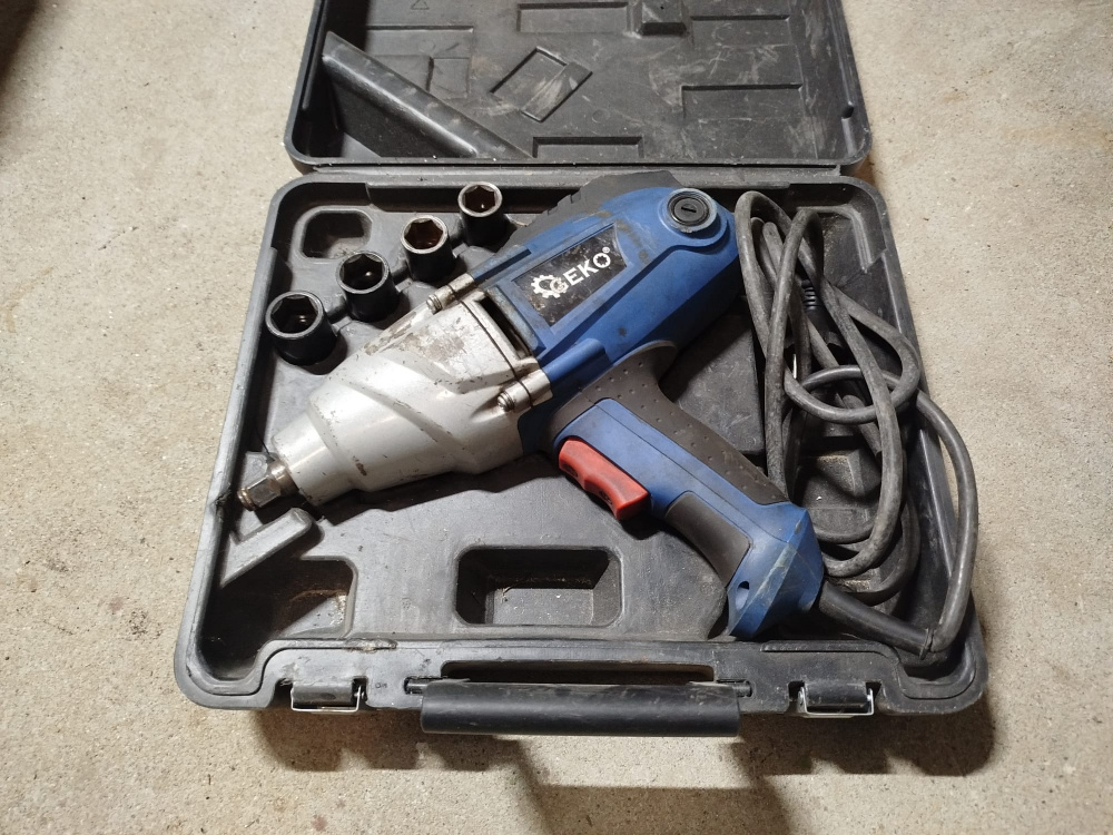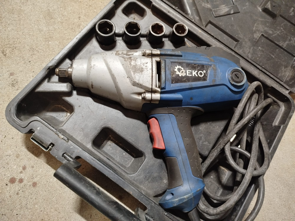 Sprzedam przewodowy klucz udarowy firmy GEKO. W zestawie z walizką oraz nasadkami udarowymi 17,19 i 21 mm.