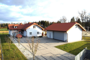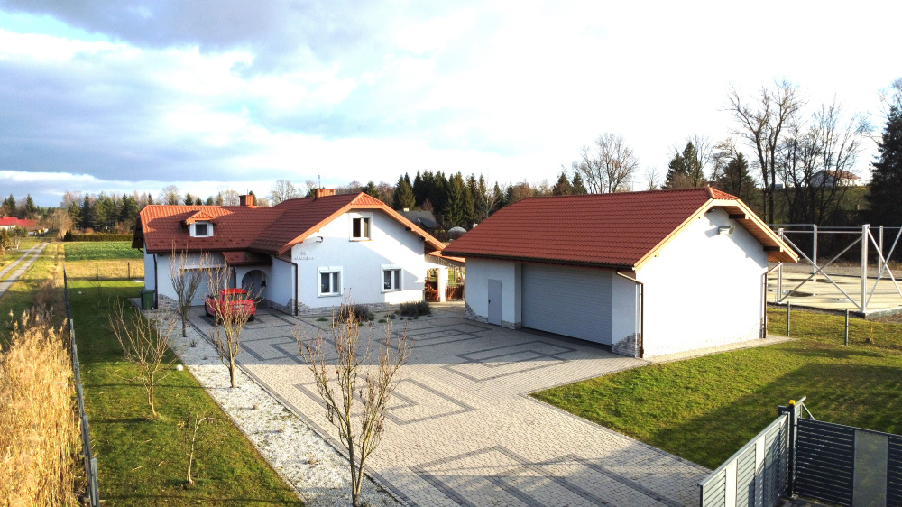 Budynek mieszkalny, dwukondygnacyjny (parter i poddasze mieszkalne) z garażem w bryle budynku oraz dużym budynkiem gospodarczym wybudowany