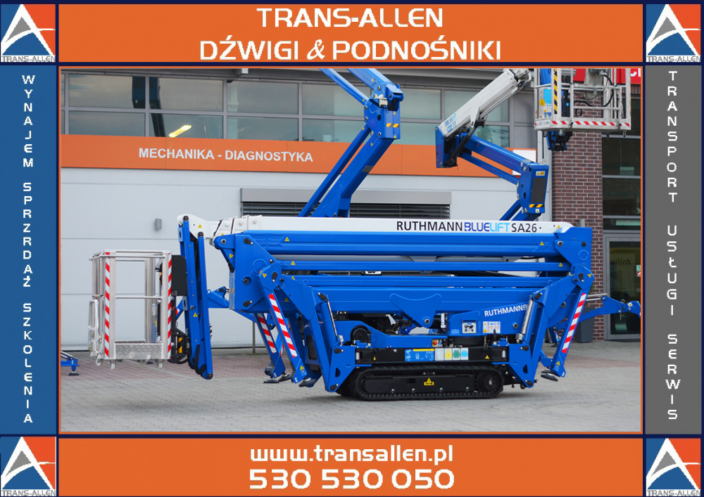 Wynajem podestów ruchomych samojezdnych na pojazdach oraz wolnobieżnych od 6 do 25m zarówno elektrycznych, jak i spalinowych w tym: nożycowych, przegubowych, teleskopowych, masztowych oraz tzw. pająków na gąsienicach.