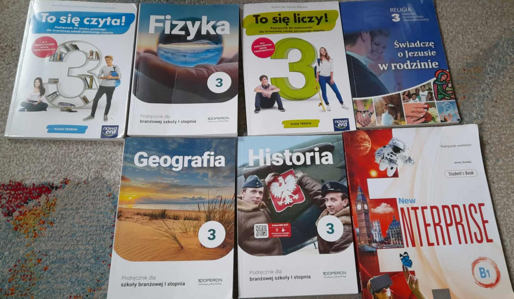 Sprzedam podręczniki do 3 klasy szkoły branżowej I stopnia. Stan idealny. Religia 15zł, angielski 40zł, pozostałe 25zł. Odbiór Krosno.