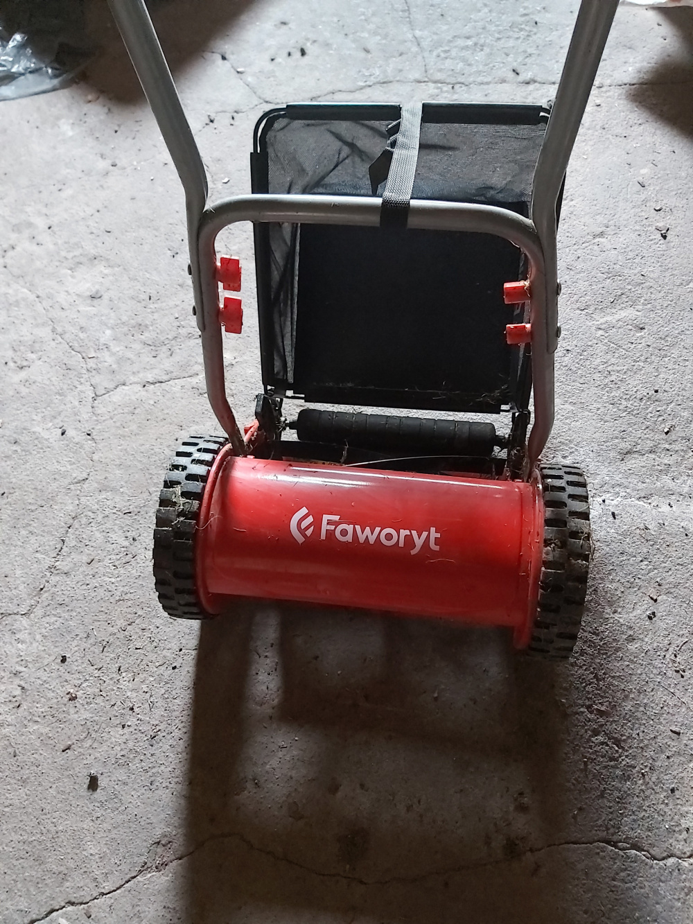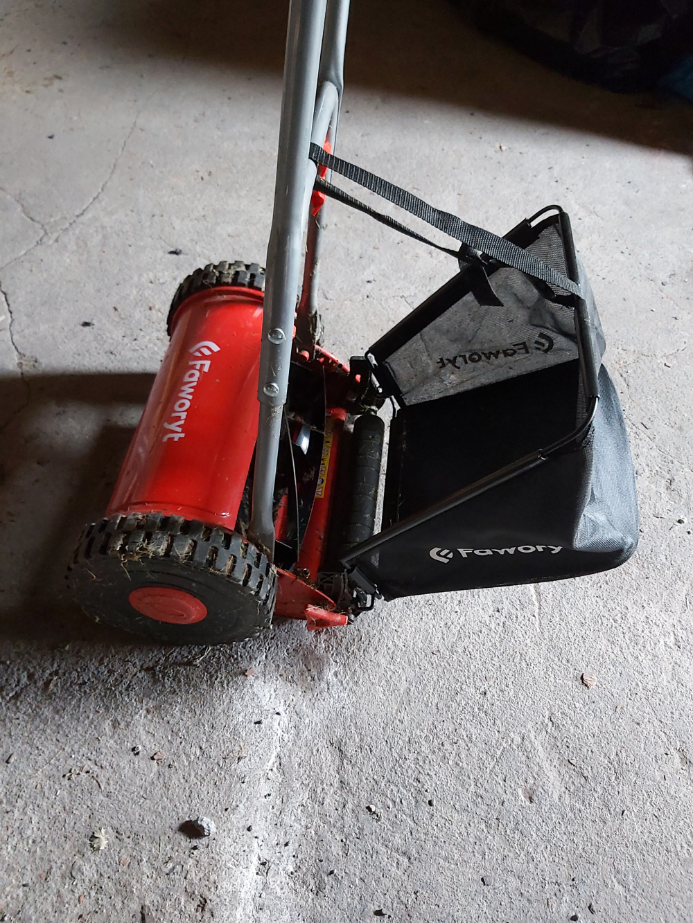 Kosiarka do trawy ręczna z koszem używana jeden sezon mała lekka poręczna do precyzyjnego podkaszania przy kwiatach krzewach itp stan bdb