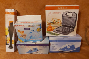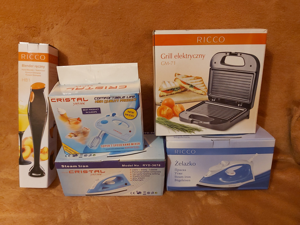 Dwa żelazka parowe nowe, dwa grille elektryczne nowe, mikser i blender ręczny nowe z pudełkiem proszę o kontakt na meila