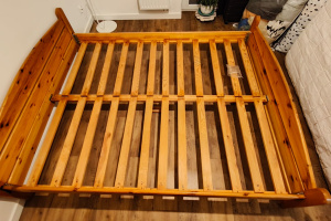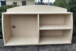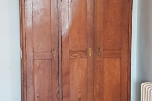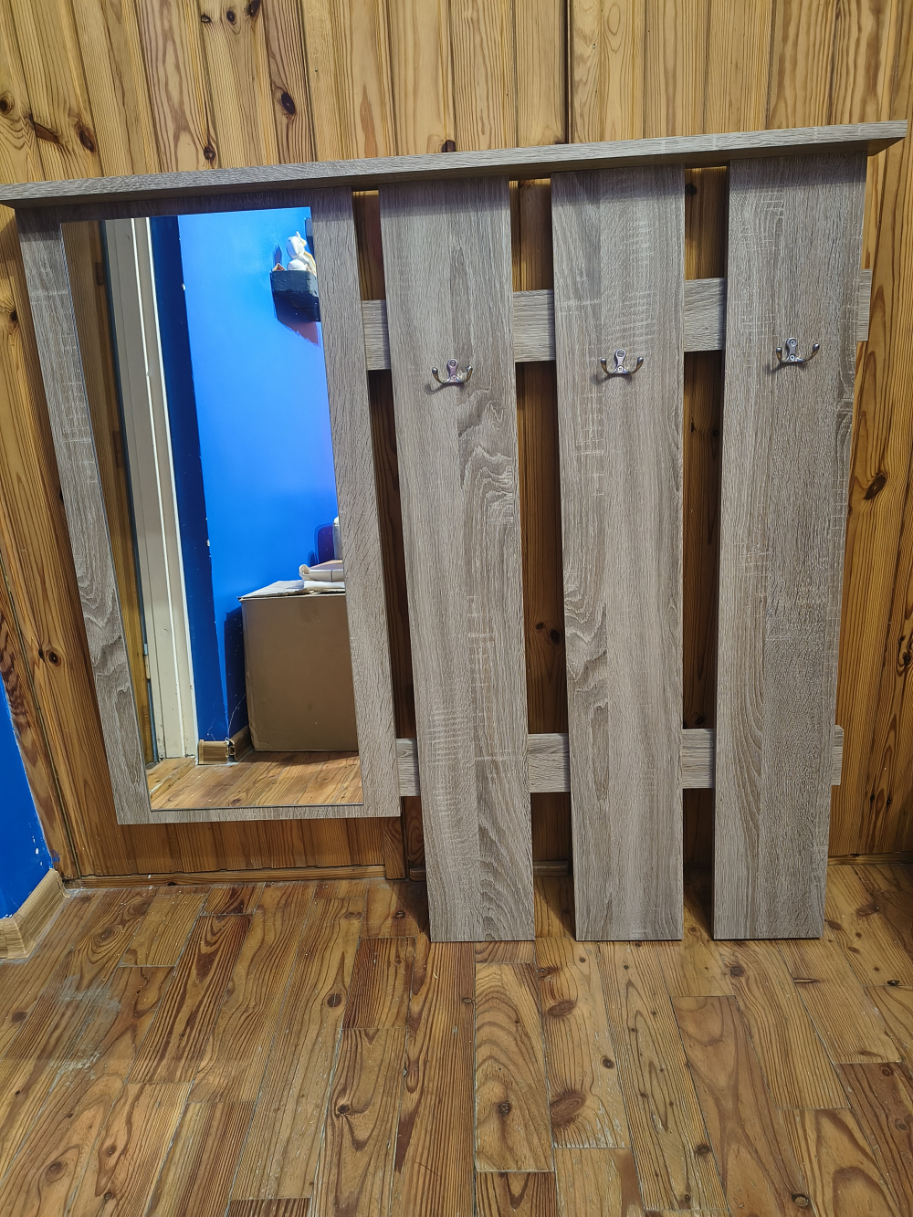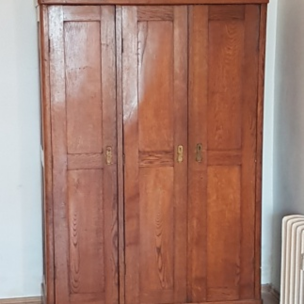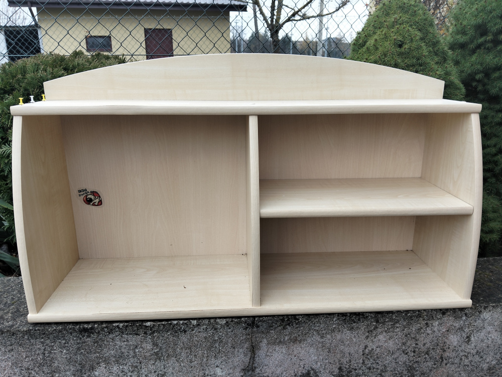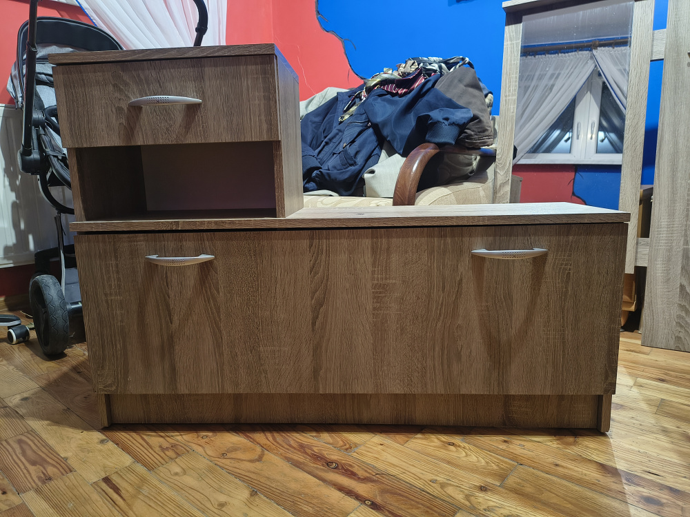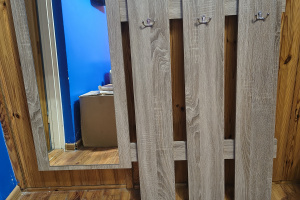 Solidna, drewniana szafka na buty z wieszakami do przechowywania obuwia w korytarzu. Produkt wykonany z wysokiej jakości materiałów, idealnie pasuje do aranżacji przestrzeni wejściowej. Praktyczne rozwiązanie do uporządkowania przedpokoju. Szerokość 100cm, widoczna na zdjęciach plama po paście do butów.