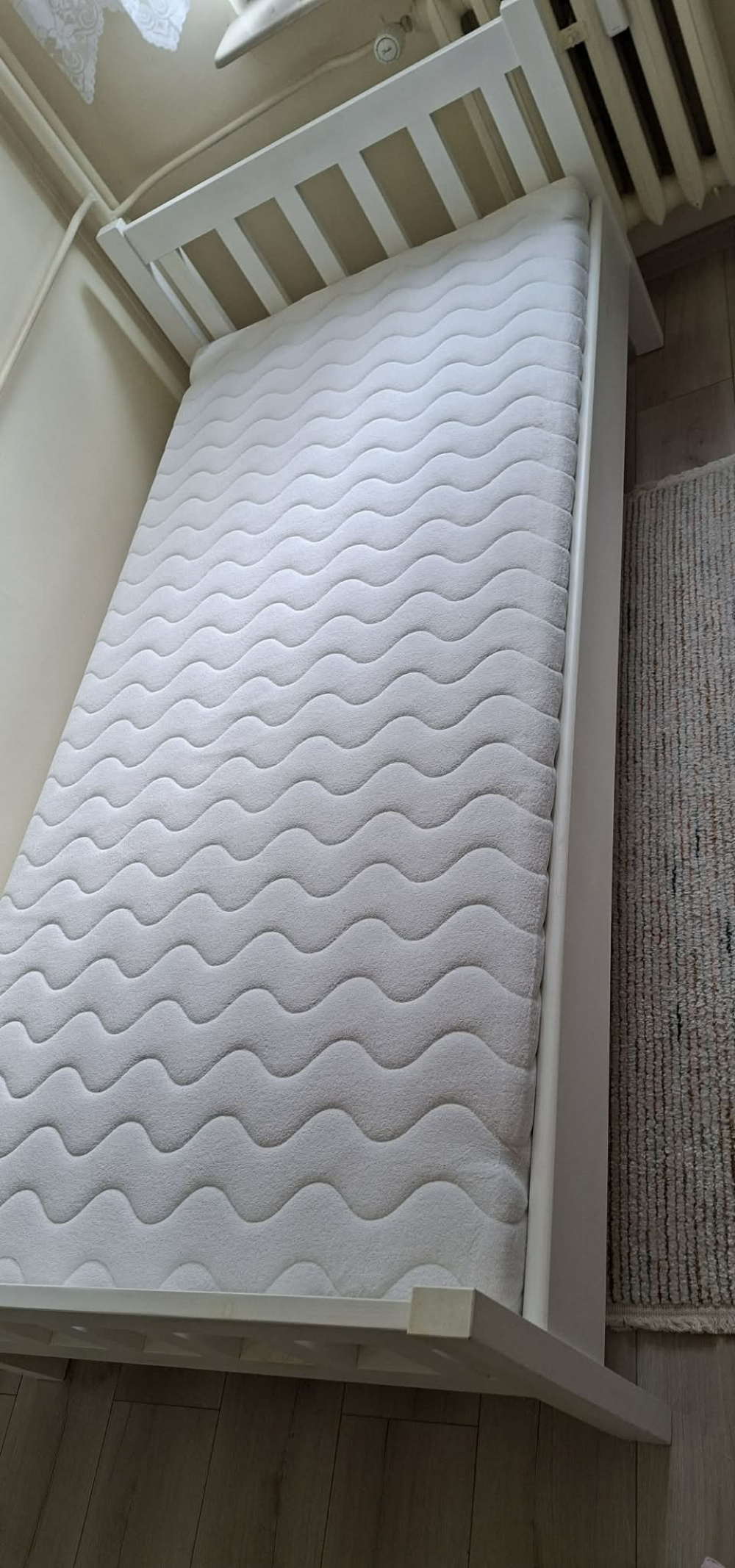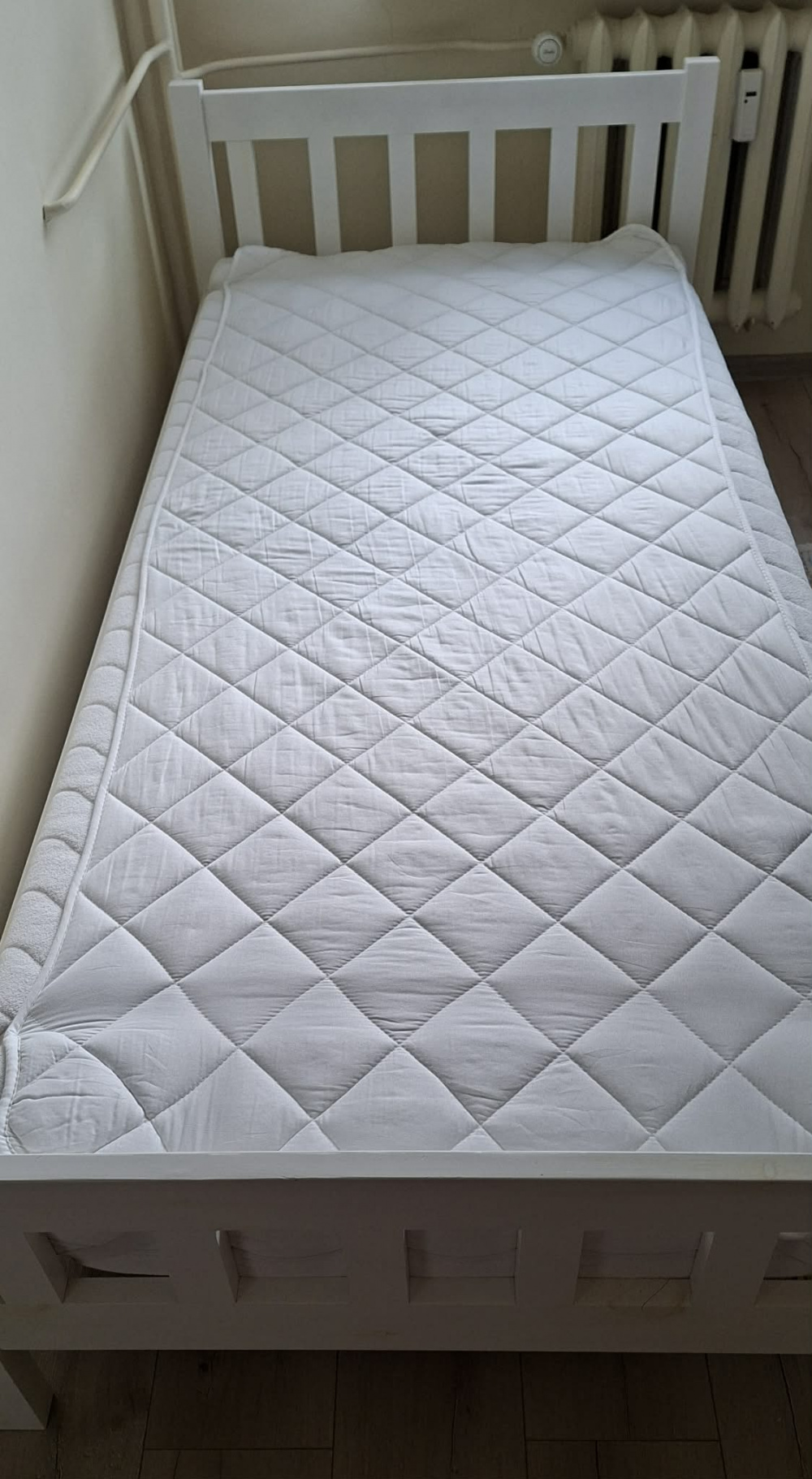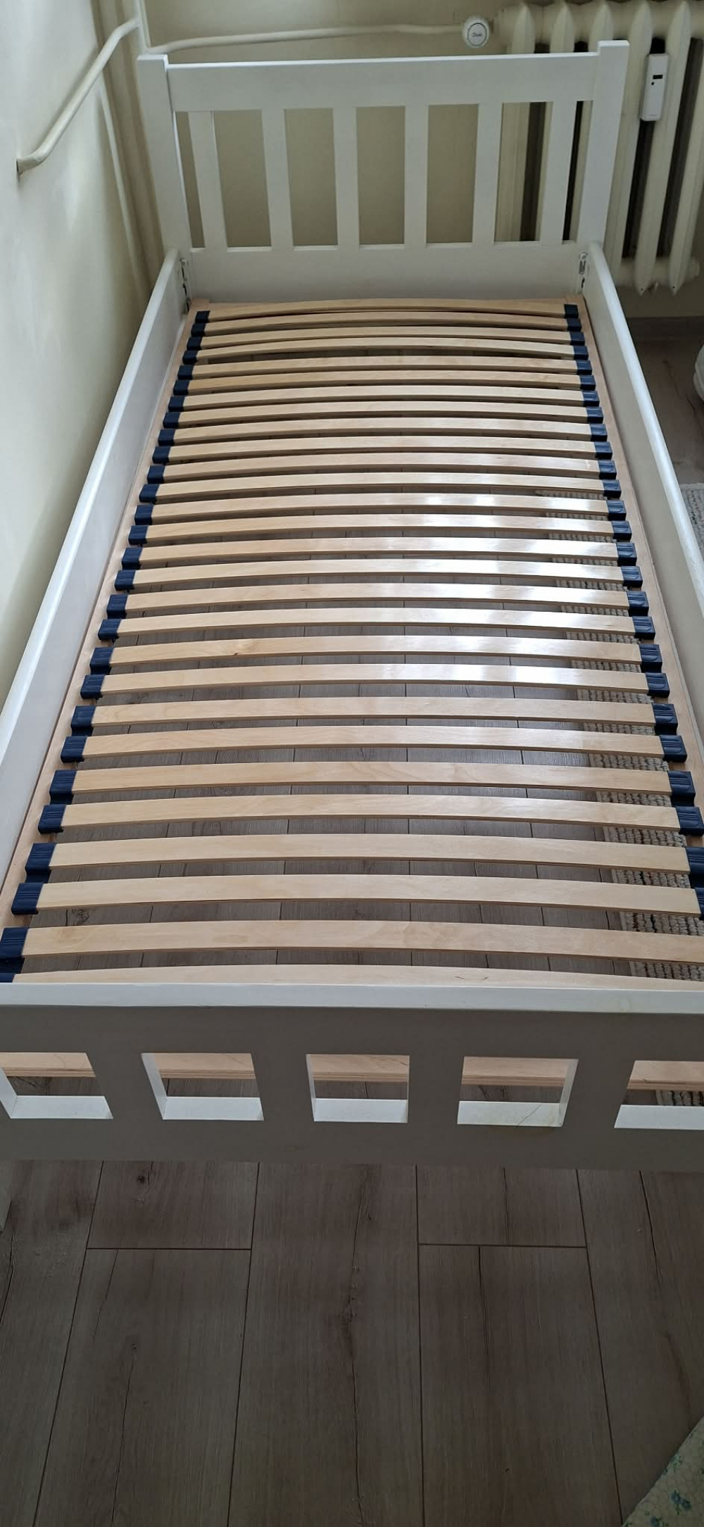... (pokaż całość)ny z mocnej płyty dobrze podparte, solidne, wytrzyma spokojnie dwie osoby po 100kg każda. Materac sprężynowy kieszeniowy Dream Zone z wkładką kokosową i ściąganym pokrowcem do prania o wymiarach 120x200x17cm, gratis prześcieradło bawełniane z gumką. Łóżko do transportu można łatwo rozkręcić, wszystkie połączenia na śrubach meblowych konfirmaty i wkrętach. Stan jak na zdjęciach, ogólnie dobry, może spokojnie służyć jeszcze wiele lat. Odbiór osobisty Krosno dzielnica Polanka.