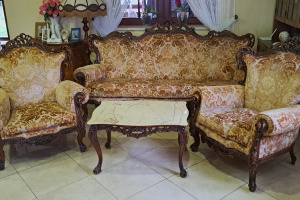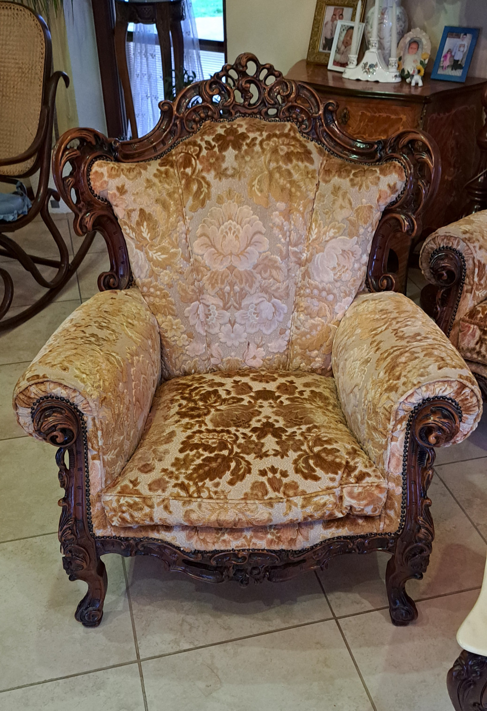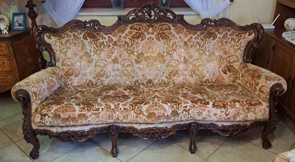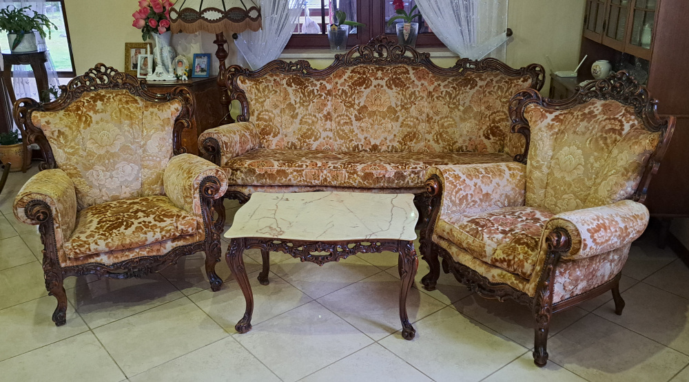 Komplet wypoczynkowy Rokoko bogato ręcznie rzeźbiony kanapa plus 2 fotele plus ława. Kanapa dl. 210 cm , szer całkowita 90 cm siedzisko 60 cm . Fotel dl 92 szer całkowita 80 cm siedzisko 52 cm . Ława blat marmurowy dl 82cm szer 56 cm . Nie wymaga renowacji . Cena 5500zl do negocjacji.