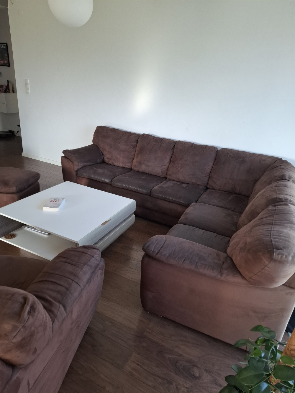 Sprzedam komplet mebli wypoczynkowych. Naroznik prawostronny, fotel oraz pufa.