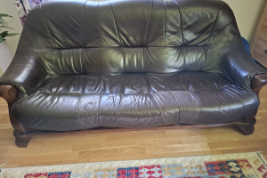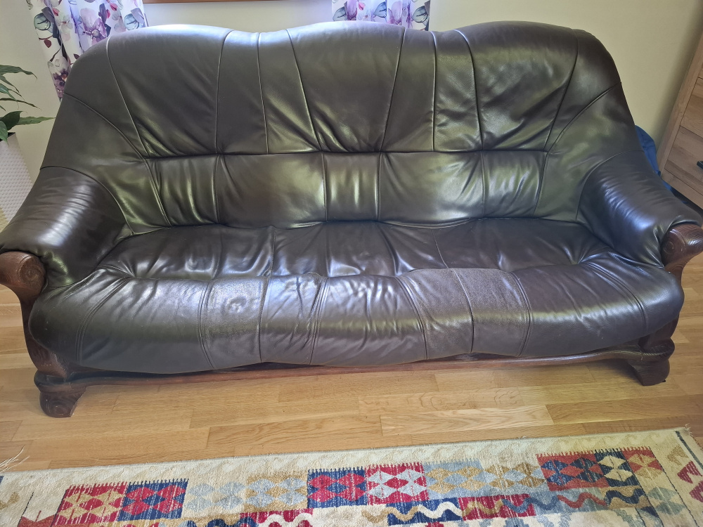 Sprzedam używaną 3-osobową sofę skórzaną na drewnianym stelażu.
