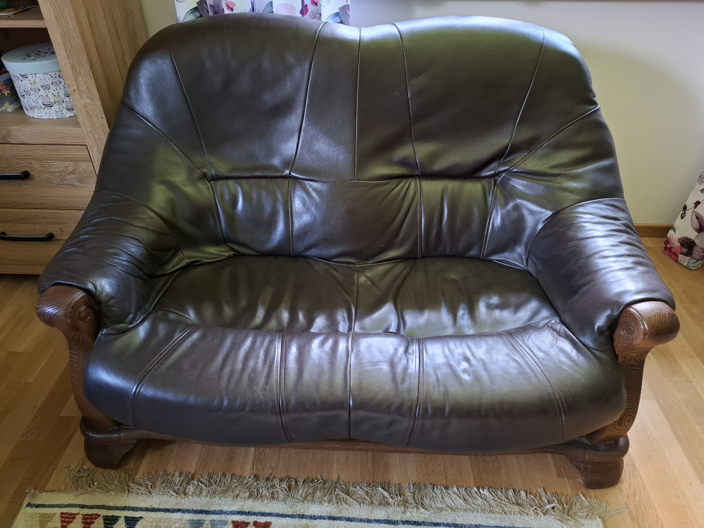Sprzedam używaną 2-osobową sofę skórzaną na drewnianym stelażu.