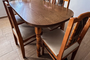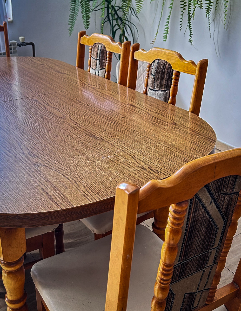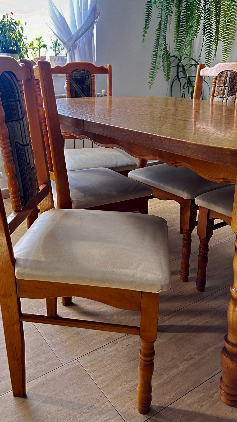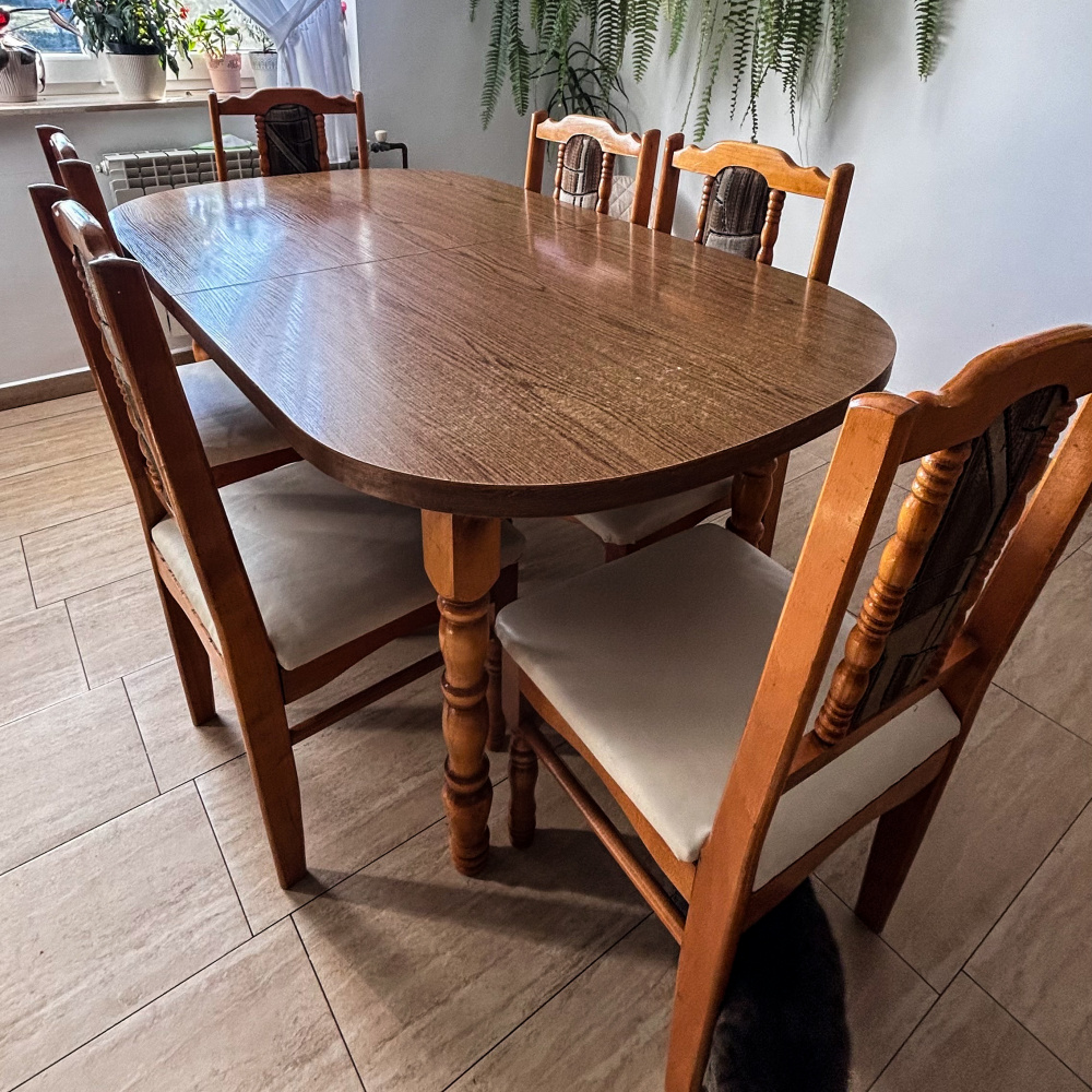 ... (pokaż całość)wka na poszerzenie stołu do dł.190. W zestawie 6 krzeseł.