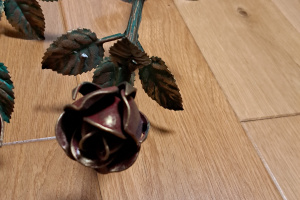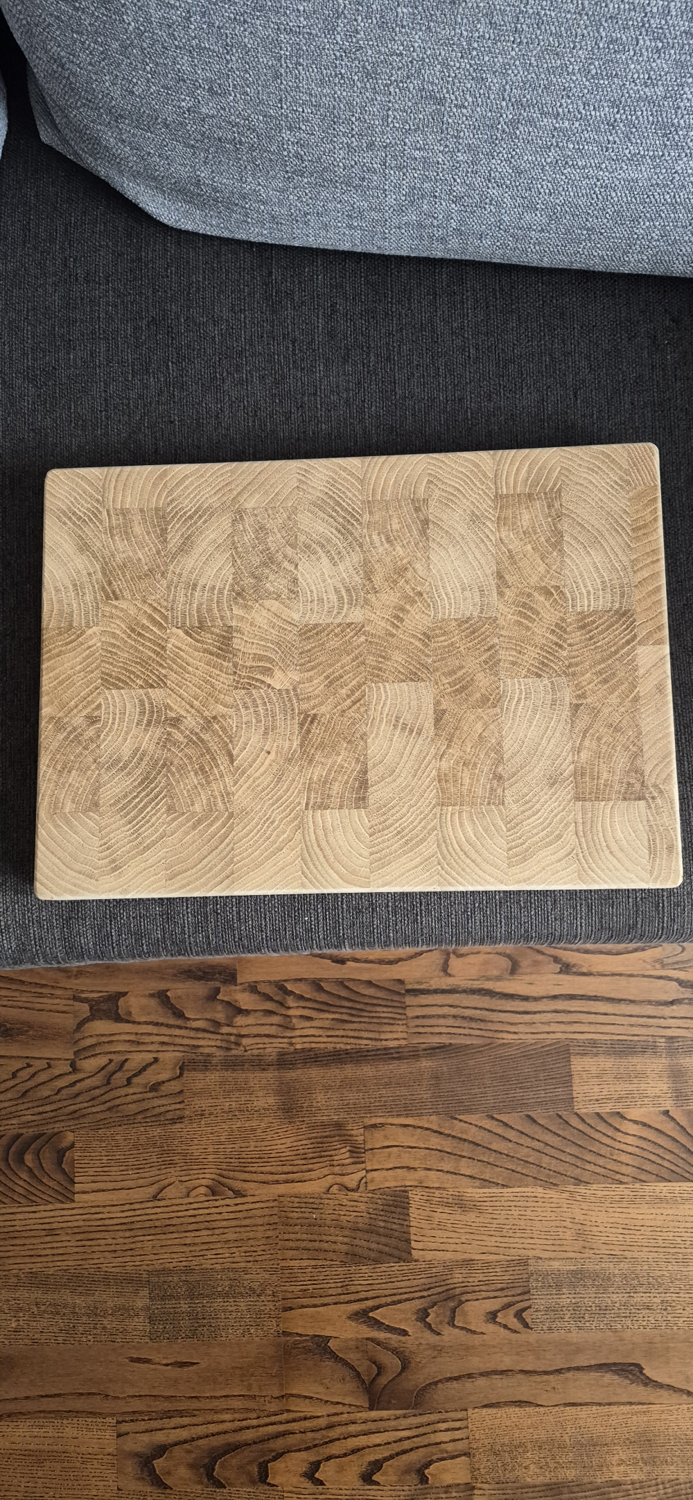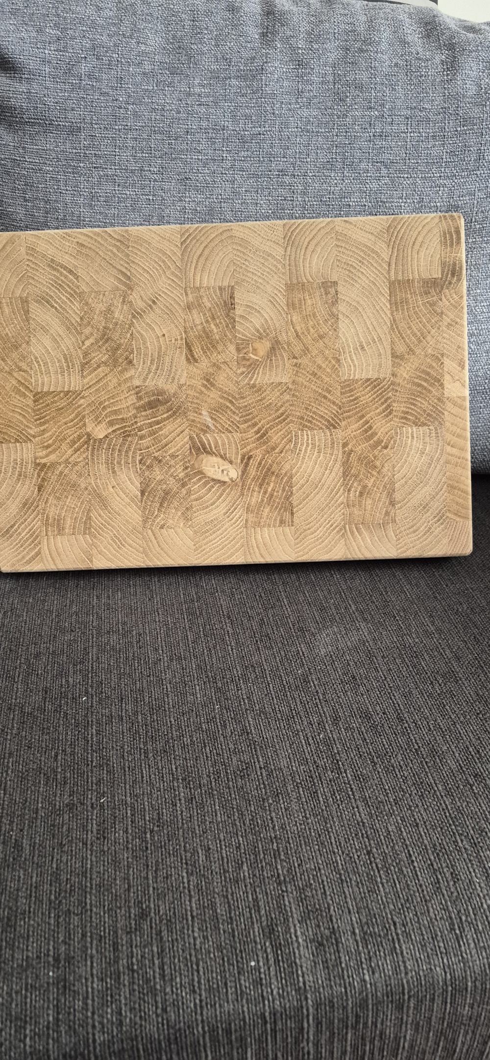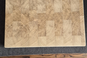 Nowa, drewniana deska do krojenia w kuchni. Deska ma ciekawy, geometryczny wzór, który nadaje jej nowoczesny wygląd. Wykonana z wysokiej jakości drewna dębowego powinna służyć przez długi czas. Idealna do przygotowywania posiłków, krojenia warzyw, owoców lub mięsa. Nie olejowana.