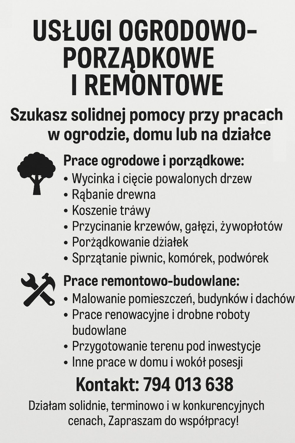 Oferuję usługi w zakresie drobnych prac remontowo wykończeniowych oraz usuwaniu wszelkiego rodzaju usterek zarówno w domu jak i w mieszkaniu, ale także w ogrodzie i na działce.