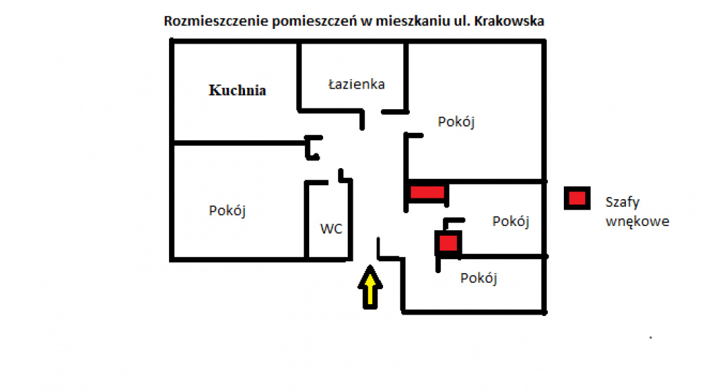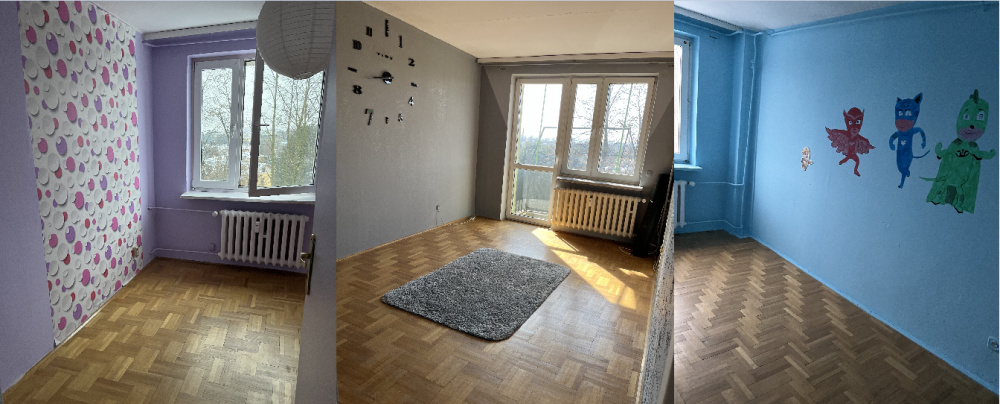 ... (pokaż całość)kon (widok na część rekreacyjną osiedla). W sypialni dwie przesuwne dwudrzwiowe szafy, kanapa, drewniane skrzynie do przechowywania, szafka nocna. W pokoju młodzieżowym meblościanka, stolik, kanapa, przesuwna dwuskrzydłowa szafa. W kuchni meblościanka na dwóch ścianach robiona na wymiar, stół, krzesła, lodówka, szafka. W łazience prysznic, umywalka oraz pralka. Przedpokój (w kształcie litery L) został tak umeblowany by pomieścić odzież wierzchnią. Znajduje się tutaj szafa wnękowa, szafki na buty, wieszak oraz lustro. Na wyposażeniu mieszkania znajduje się: komplet talerzy, kubki, deska do prasowania oraz przyrządy do sprzątania, tj. zmiotka z szufelką i wiadro.