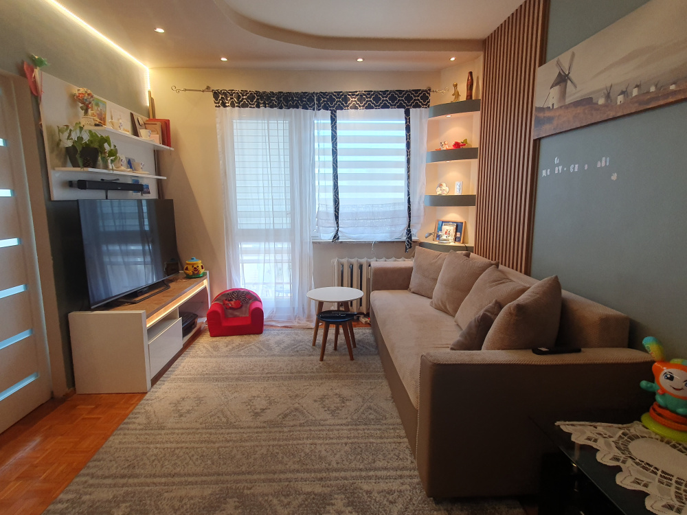 Stan techniczny: mieszkanie zadbane, gotowe do wprowadzenia się lub do odświeżenia według własnych preferencji. Na podłogach znajdują się panele oraz płytki, okna są wymienione na plastikowe (PCV).