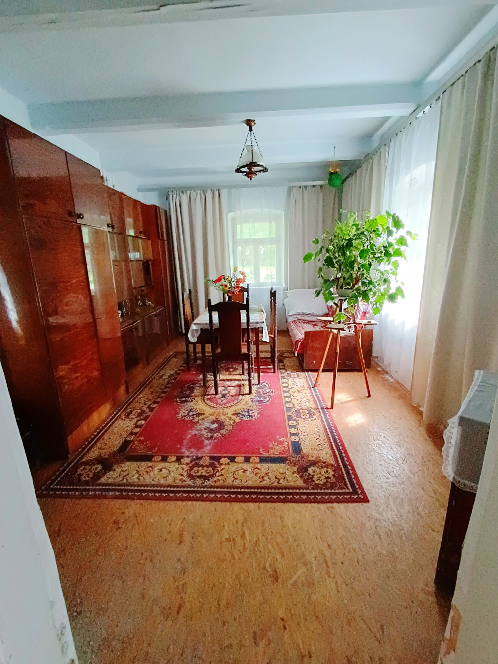 Wnętrze domu bardzo klimatyczne. Poprzez rozpoczęty remont istnieje możliwość kontynuacji według własnego projektu. Zachowana została konstrukcja z potencjałem do stylowej aranżacji. Układ pomieszczeń pozwala stworzyć wygodną część mieszkalną, wraz z użytkowym poddaszem.