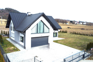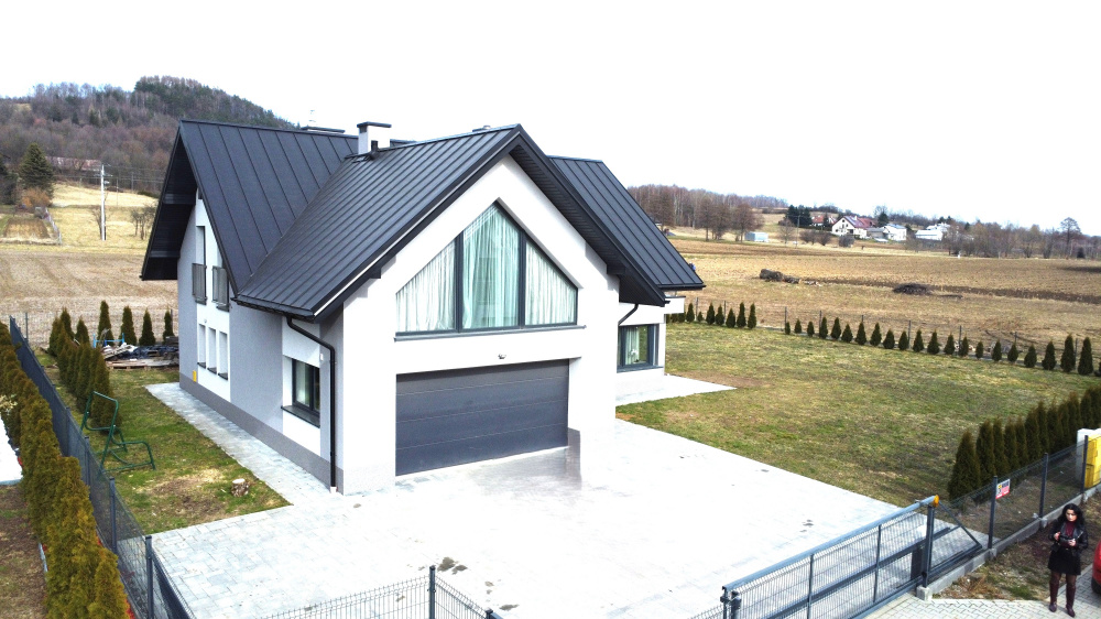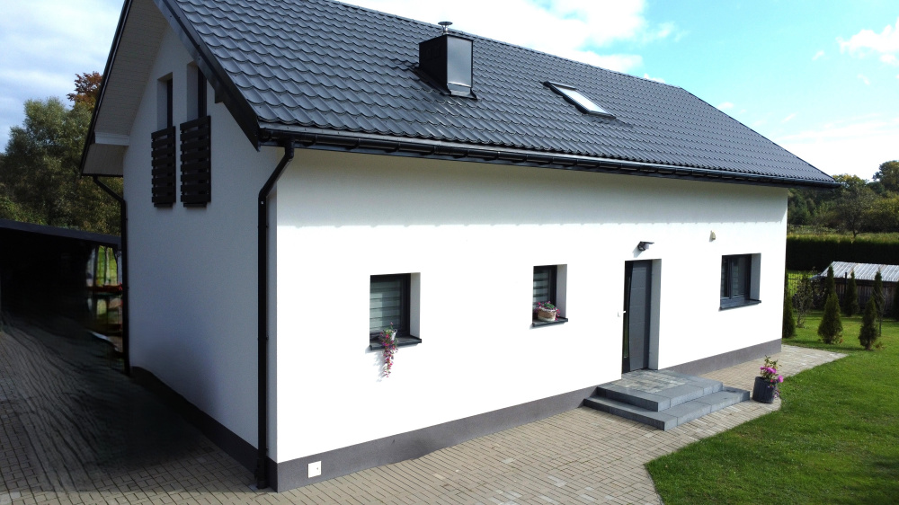 Dom został wykonany z wysokiej jakości materiałów budowlanych, w tym czerwonego pustaka ceramicznego MAX, a jego dach został pokryty blachodachówką RUKKI.