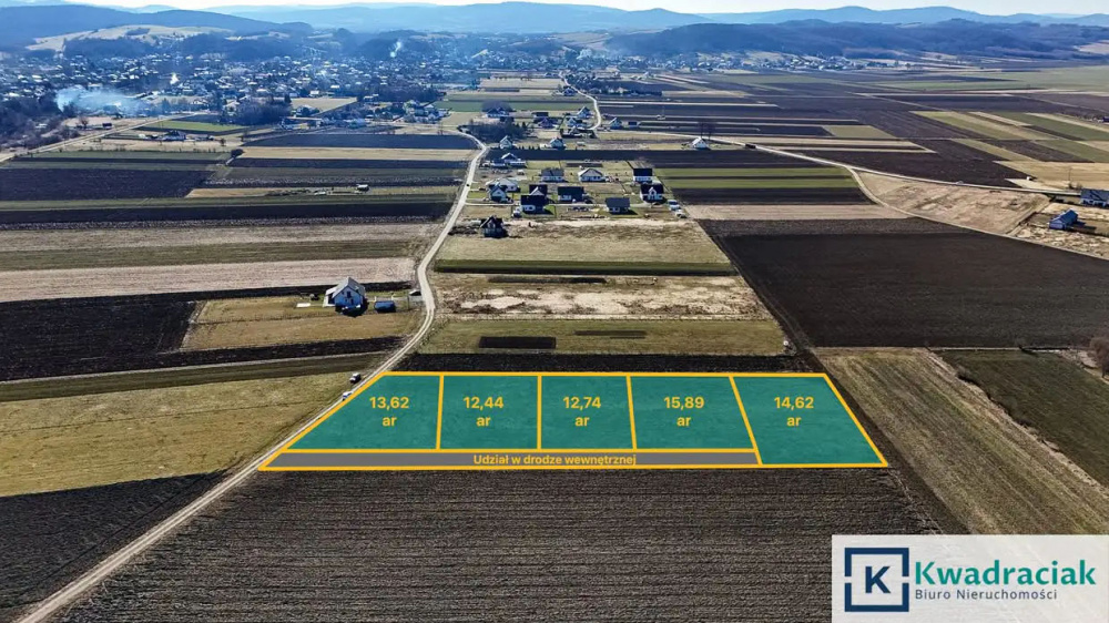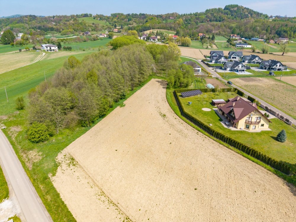 Kształt i ukształtowanie terenu: działki o kształtach regularnych i nieregularnych, lekko nachylone, co zapewnia naturalne odprowadzenie wody i atrakcyjne widoki na okoliczne wzgórza.