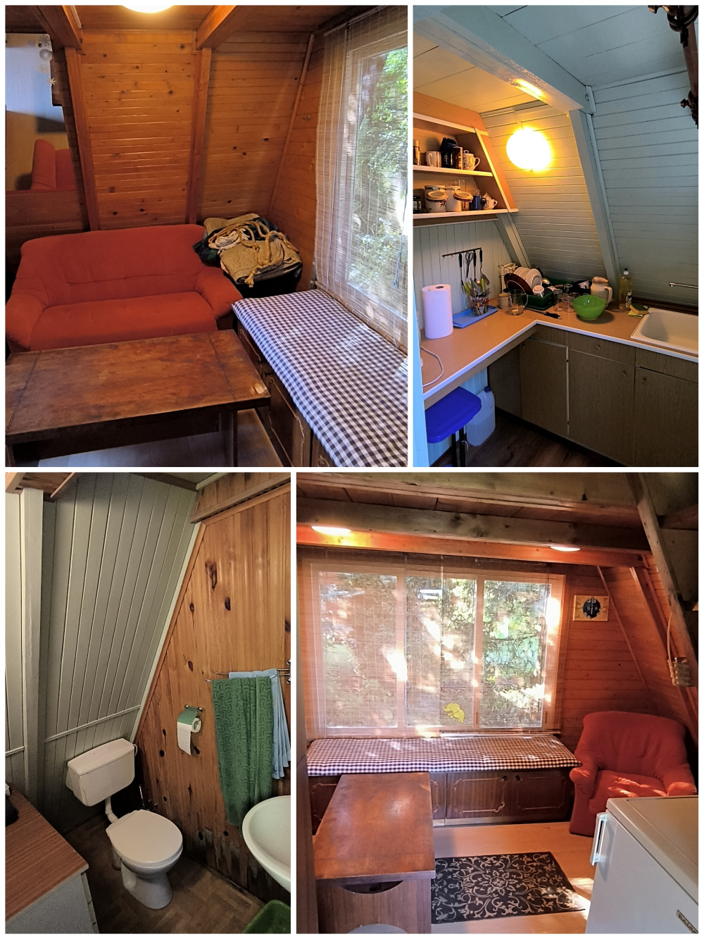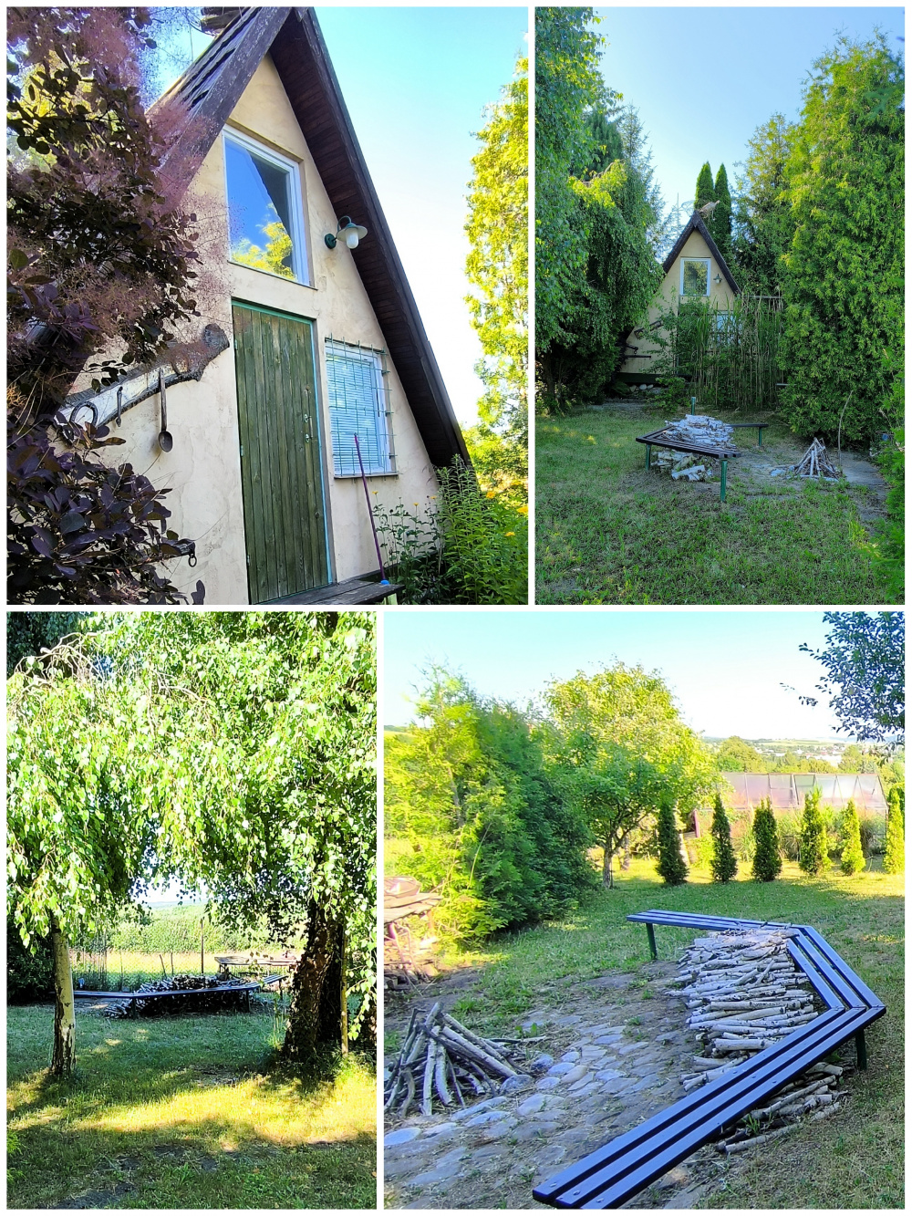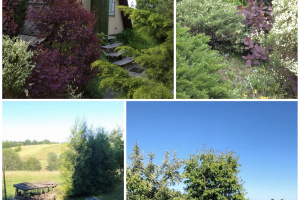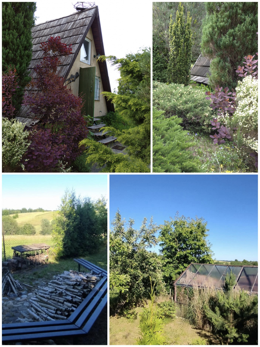 w domku jest toaleta a na działce liczne drzewa, krzewy, drzewa owocowe,