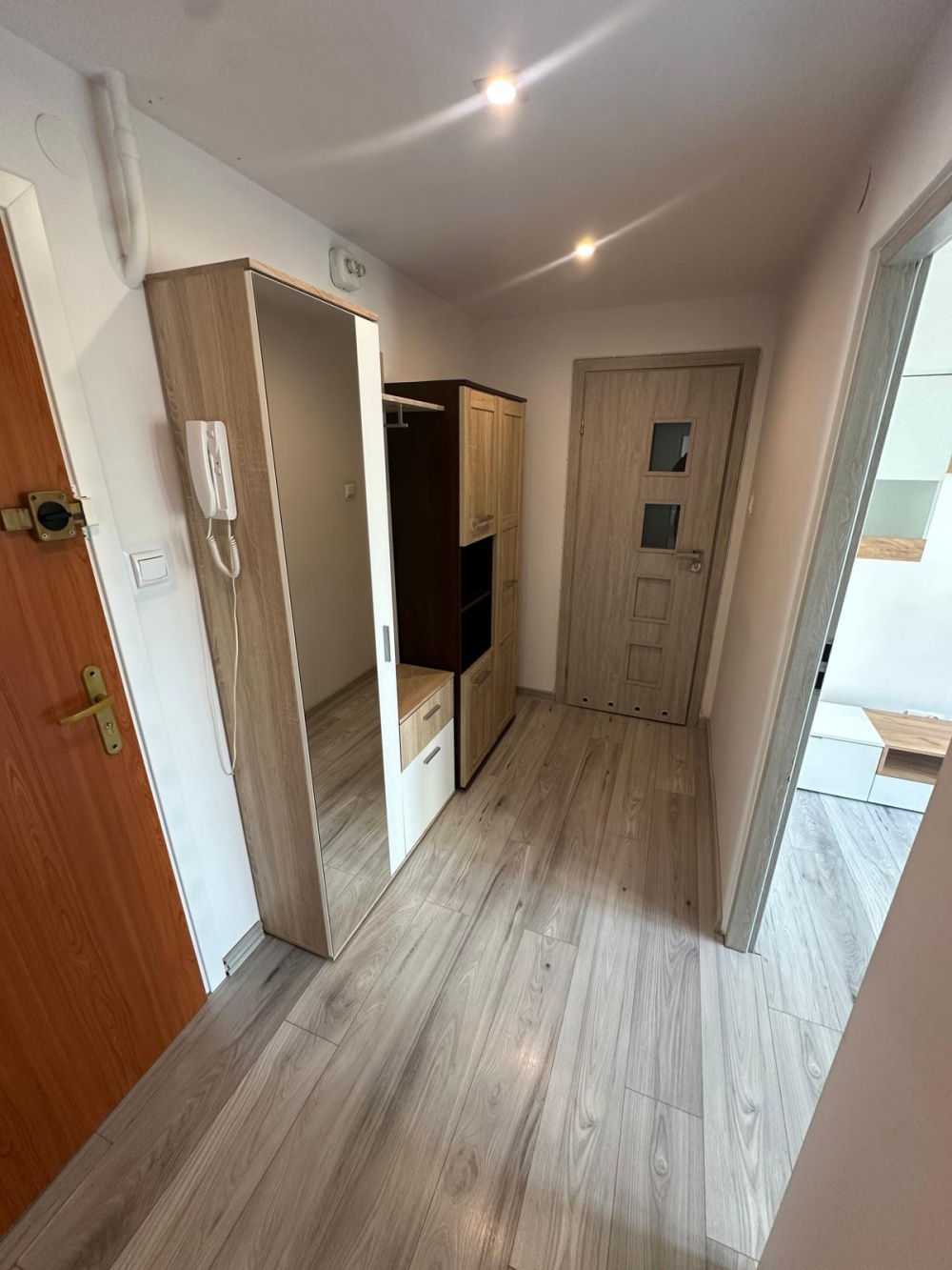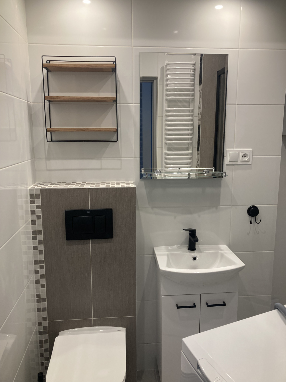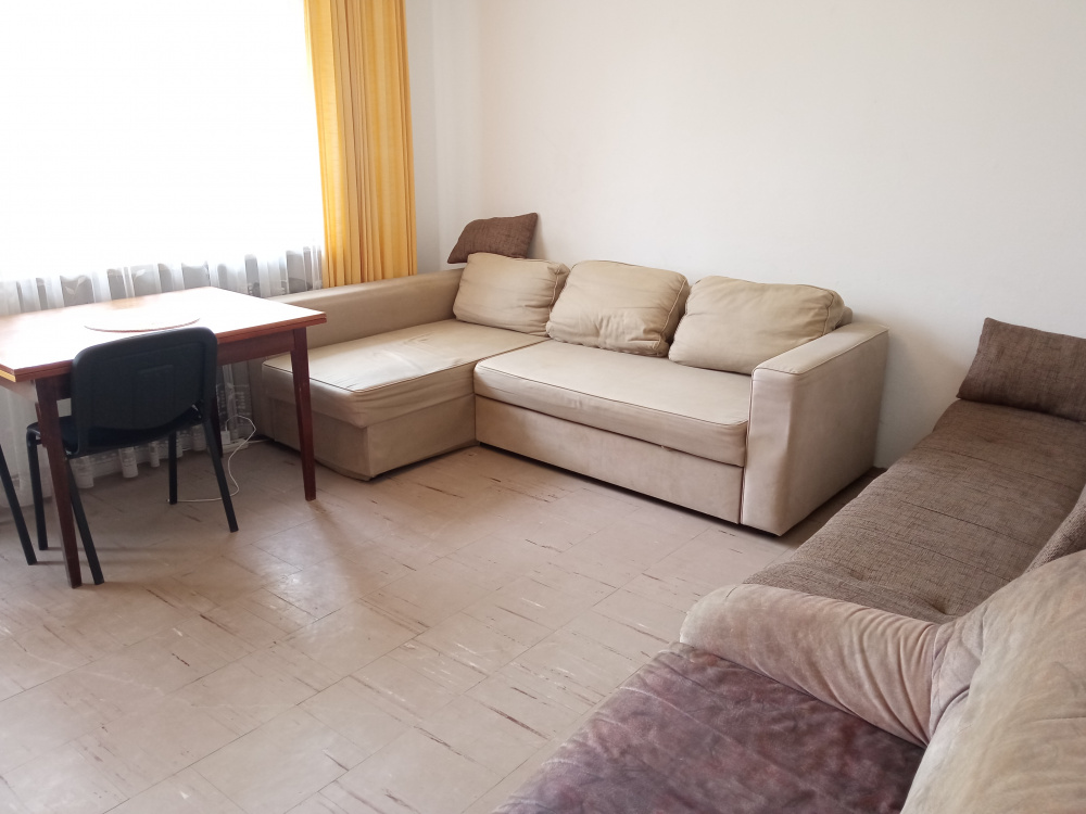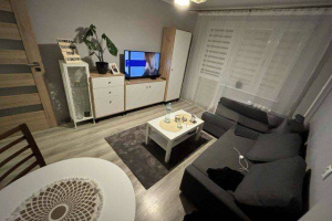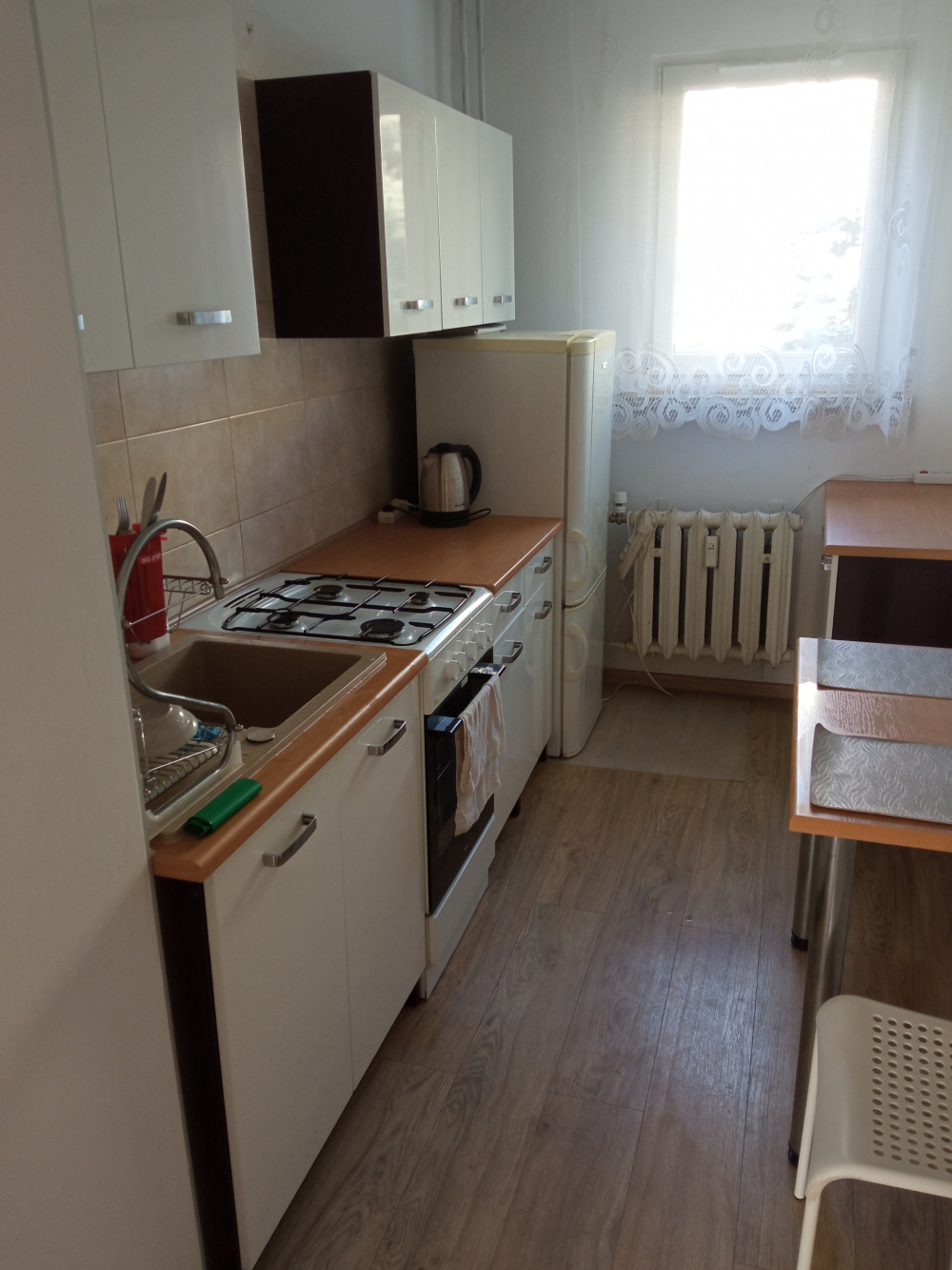 Mieszkanie 50 m, składa się z dwóch pokoi, kuchni, łazienki i przedpokoju. Mieszkanie w pełni umeblowane, duży pokój ma balkon. Jest także lodówka oraz pralka.