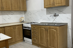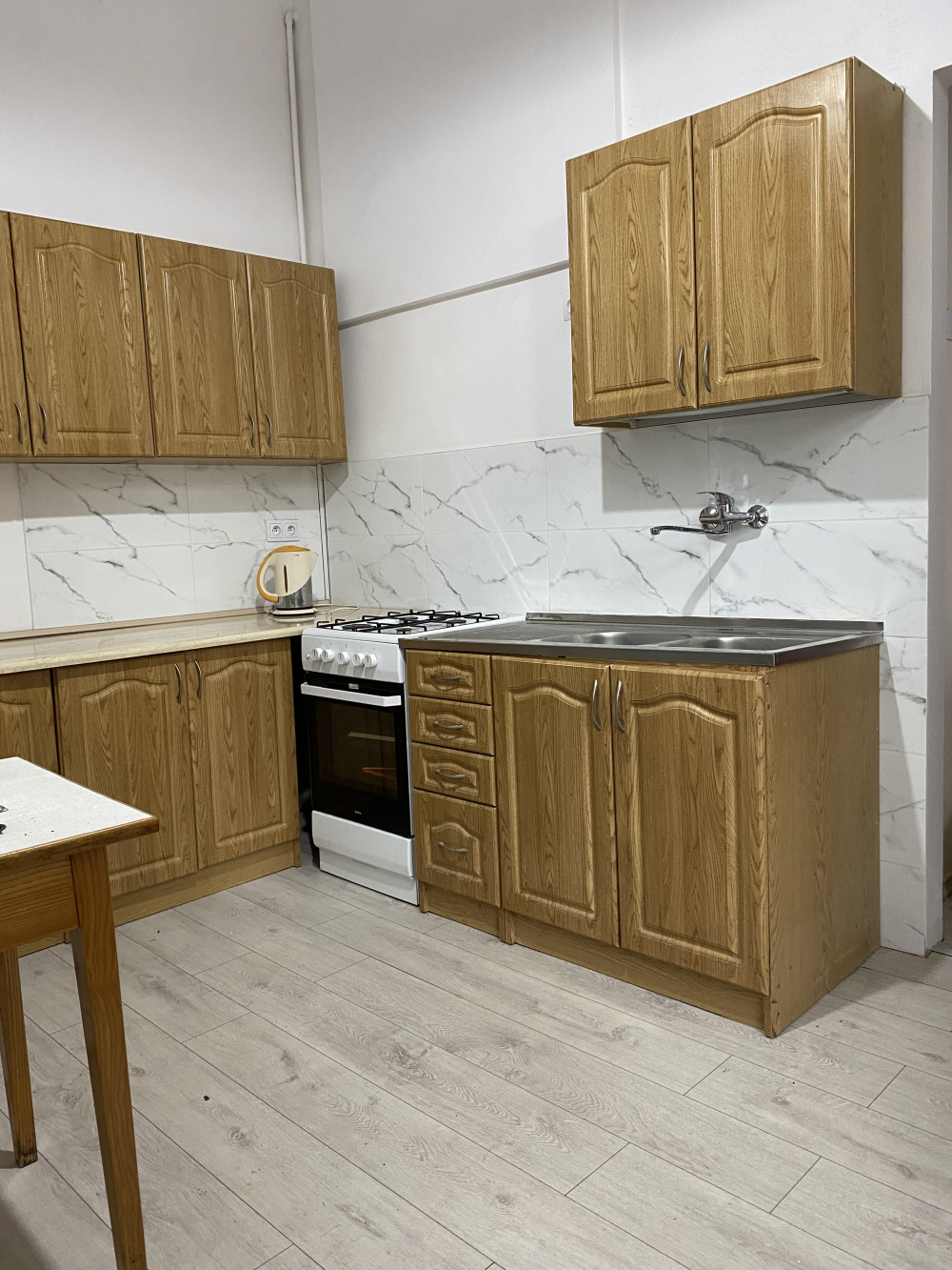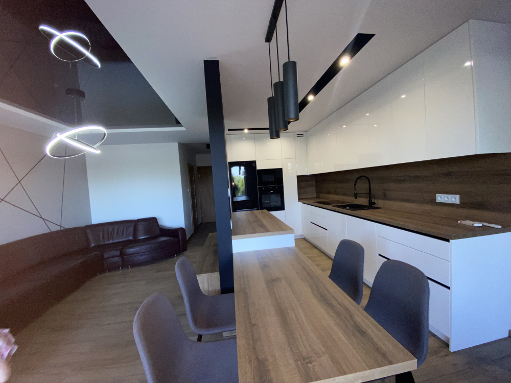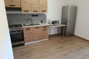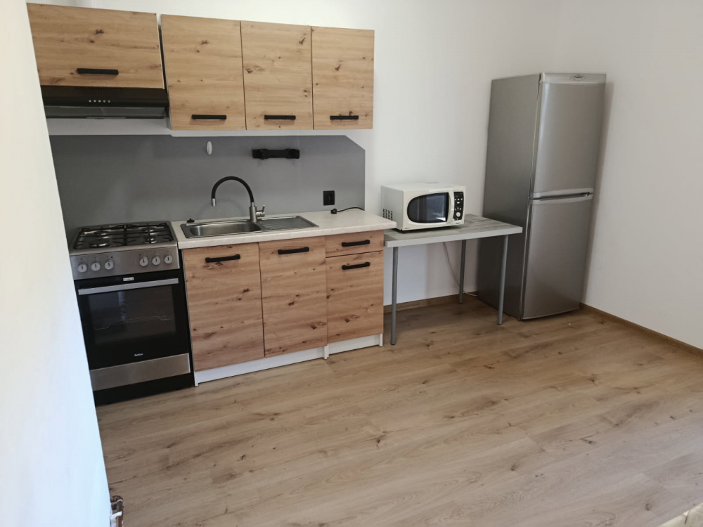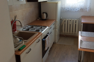 *** Kuchnia wyposażona w lodówkę, mikrofalówkę, kuchenkę gazową z piekarnikiem, szafki oraz stół.