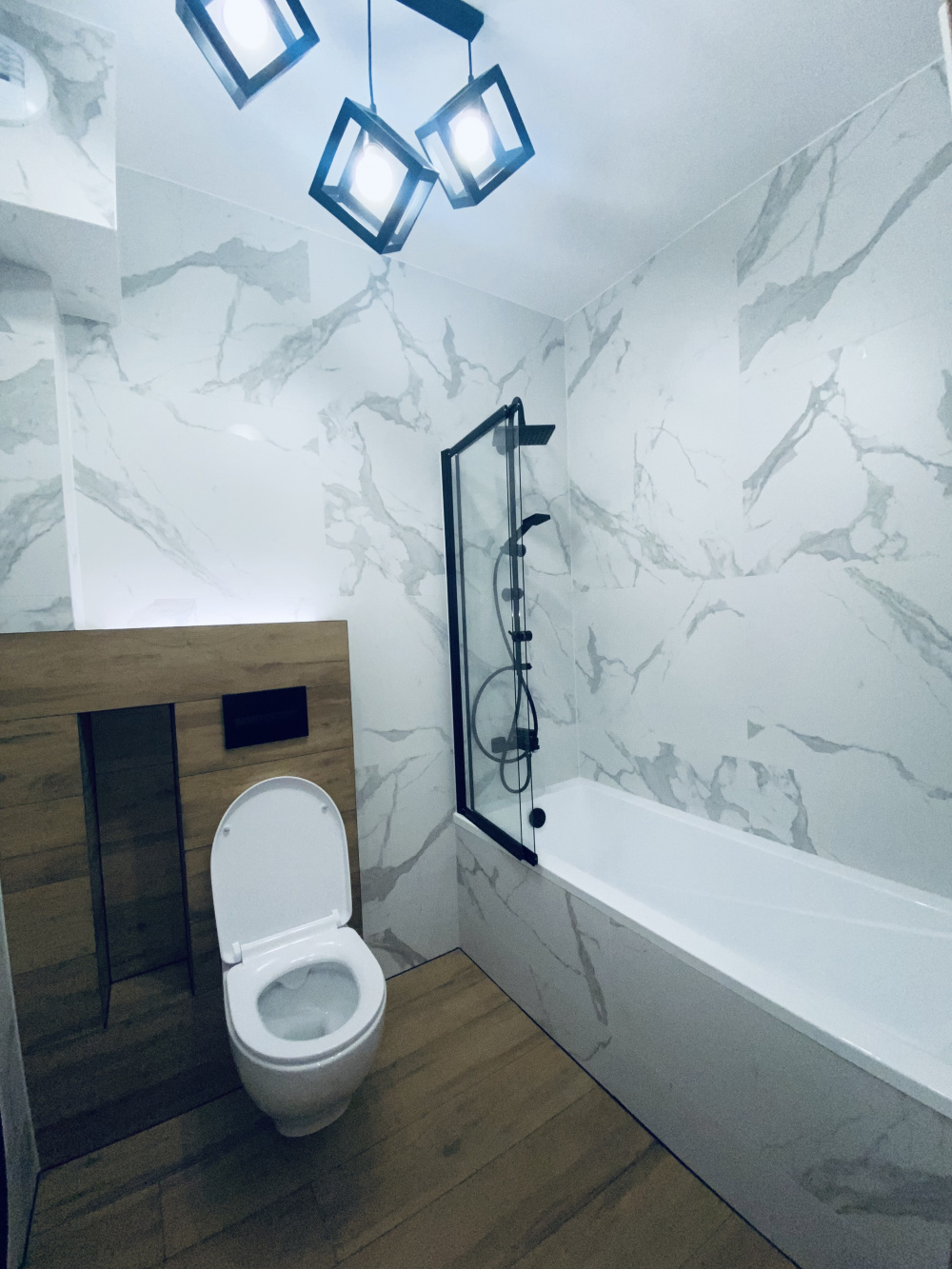 *** Łazienka z kabiną prysznicową, pralką, umywalką, wc i szafką.
