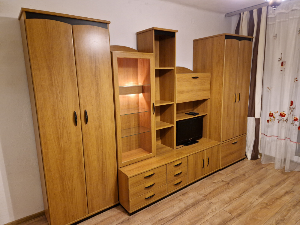 Pokój - meblościanka, rozkładany narożnik, stół, krzesła, TV