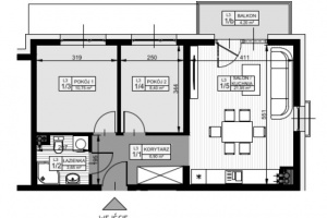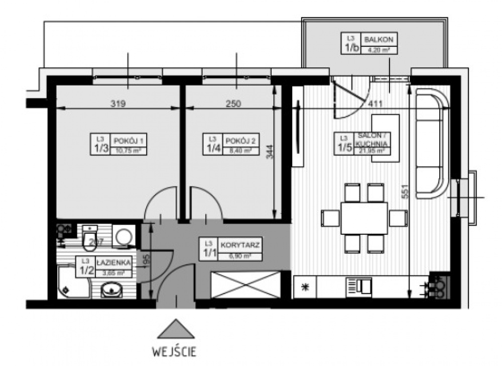Układ: salon, sypialnia, kuchnia, łazienka, przedpokój