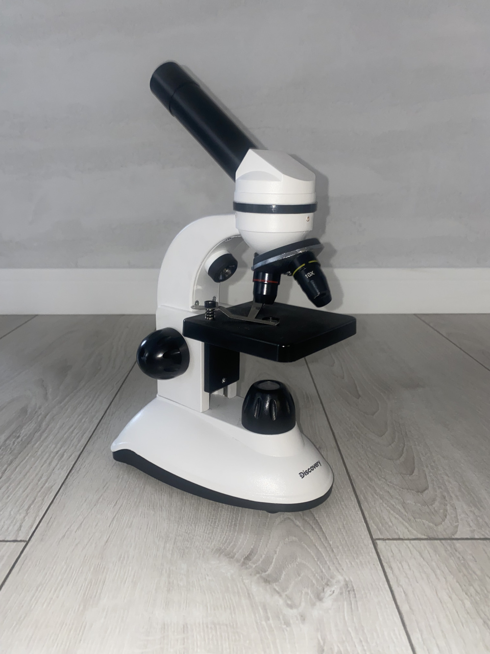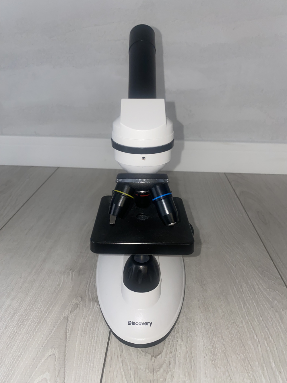 Mikroskop „Discovery” to używany przyrząd do obserwacji mikroświata. Doskonały dla młodych naukowców, umożliwia przyjazne poznanie niezwykłych detali świata. Zaskocz swoje dziecko i rozbudź jego ciekawość dzięki temu fascynującemu urządzeniu! Mikroskop posiada 2 guziki którymi się włącza światełka. Powiększenie wynosi 4X, 10X, 40X. Ma on także metalowe chwytaki/patyki które przytrzymują obiekt be