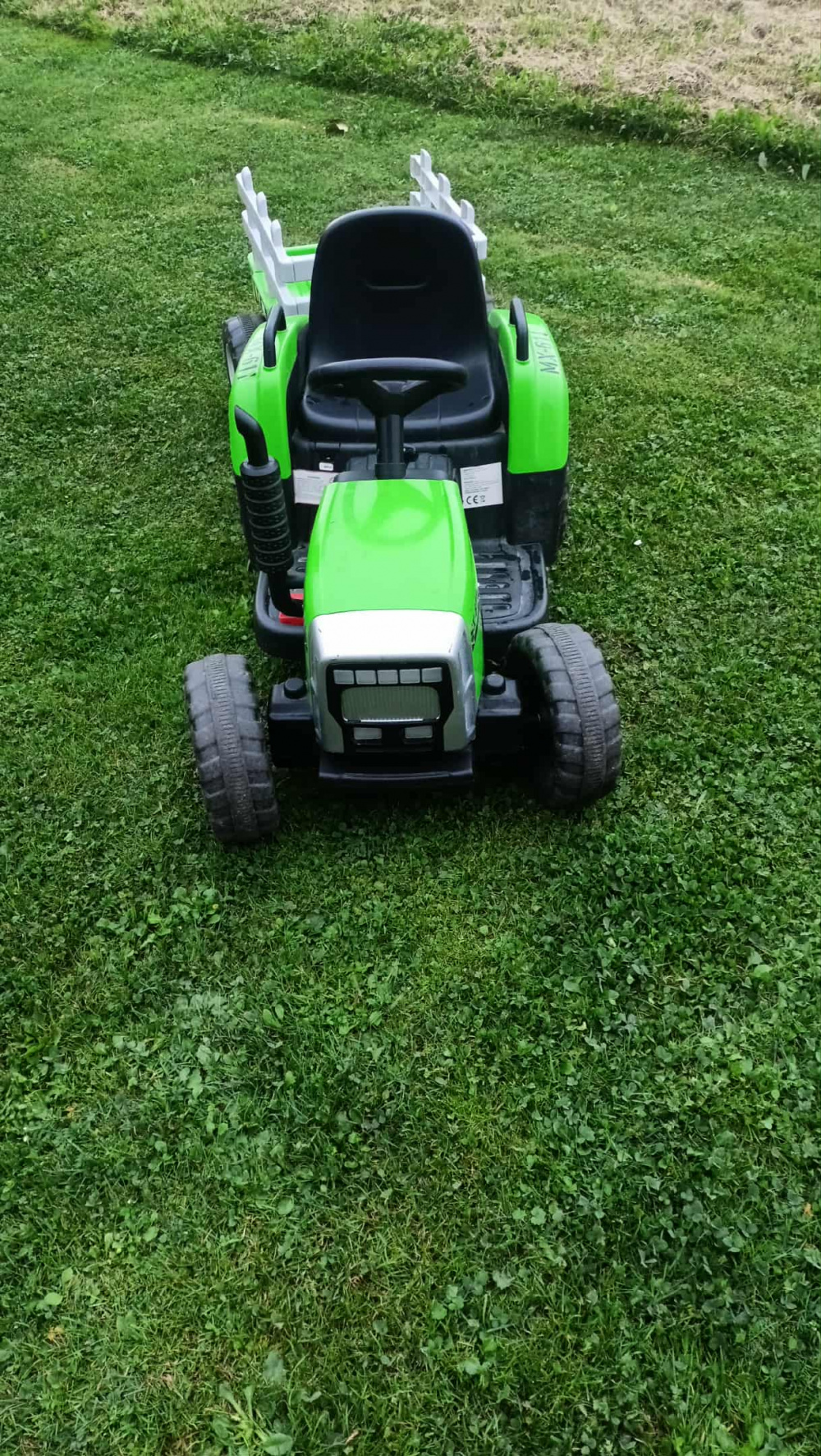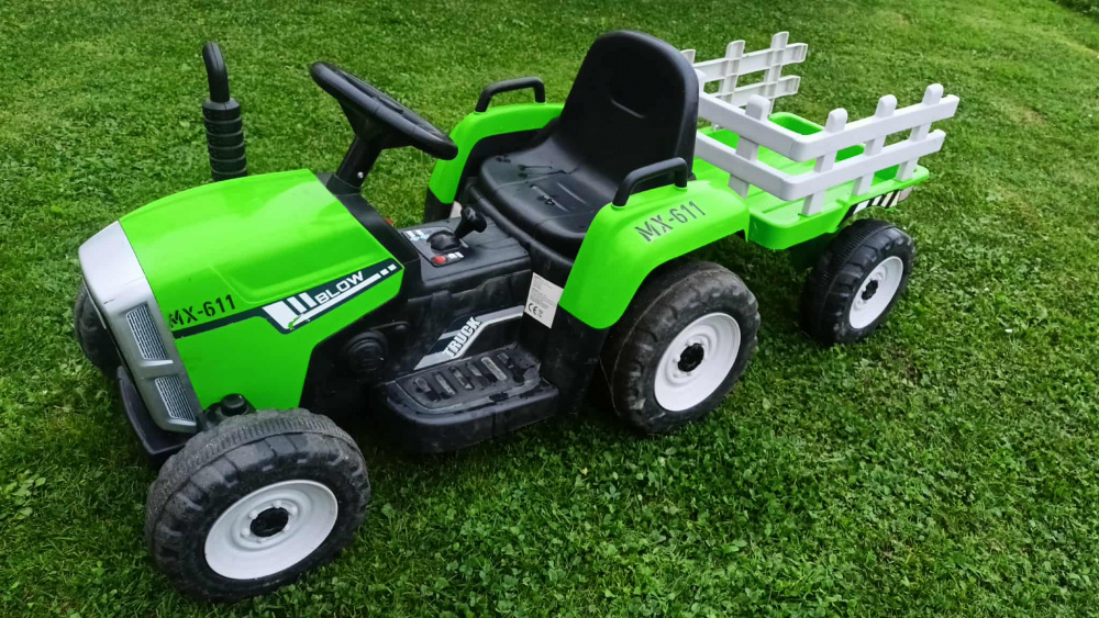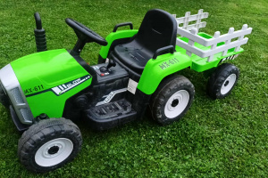 Traktor na akumulator z przyczepką.