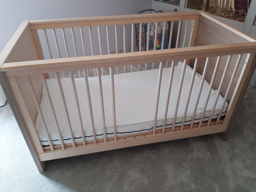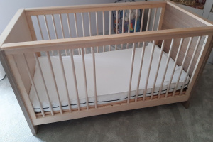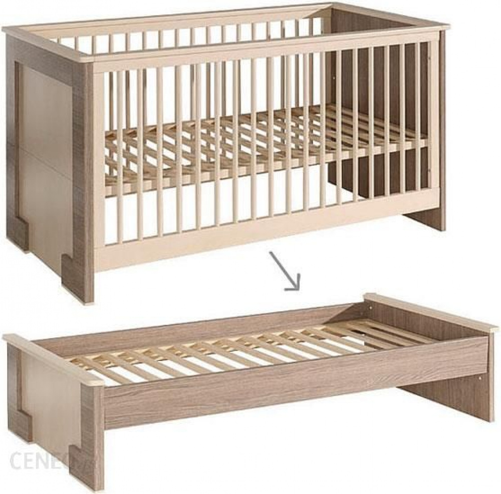 Łóżko nawiązujące do najnowszych trendów włoskiego designu zrobione jest z płyty laminowanej w oryginalnym kolorze szarego dębu łączonego z dębem cremona. Podłoga łóżka, listwy nóg oraz boczki szczeblinowe wykonane są z drewna malowanego na jasny kolor. Łóżko posiada trzy poziomy regulacji wysokości podłogi oraz możliwość przerobienia na tapczanik dla starszego dziecka. Do łóżka jest materac. Wym