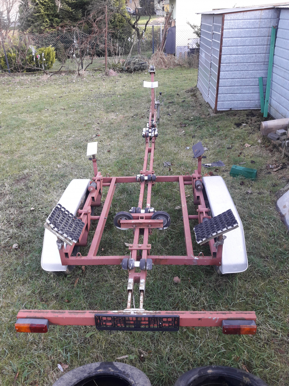 Sprzedam mocną i solidną przyczepę do transportu żaglówek, łodzi motorowych, może posłużyć również jako tzw. dłużyca. Ładowność ok. 2000 kg. Długość łodzi do ok. 7m. Regulacja wysunięciem dyszla. Wyposażona w instalację oświetleniową, wciągarkę na dziobnicy, 4 łapy regulowane na gwincie trapezowym, kółko podporowe. Nie rejestrowana. Cena do negocjacji.