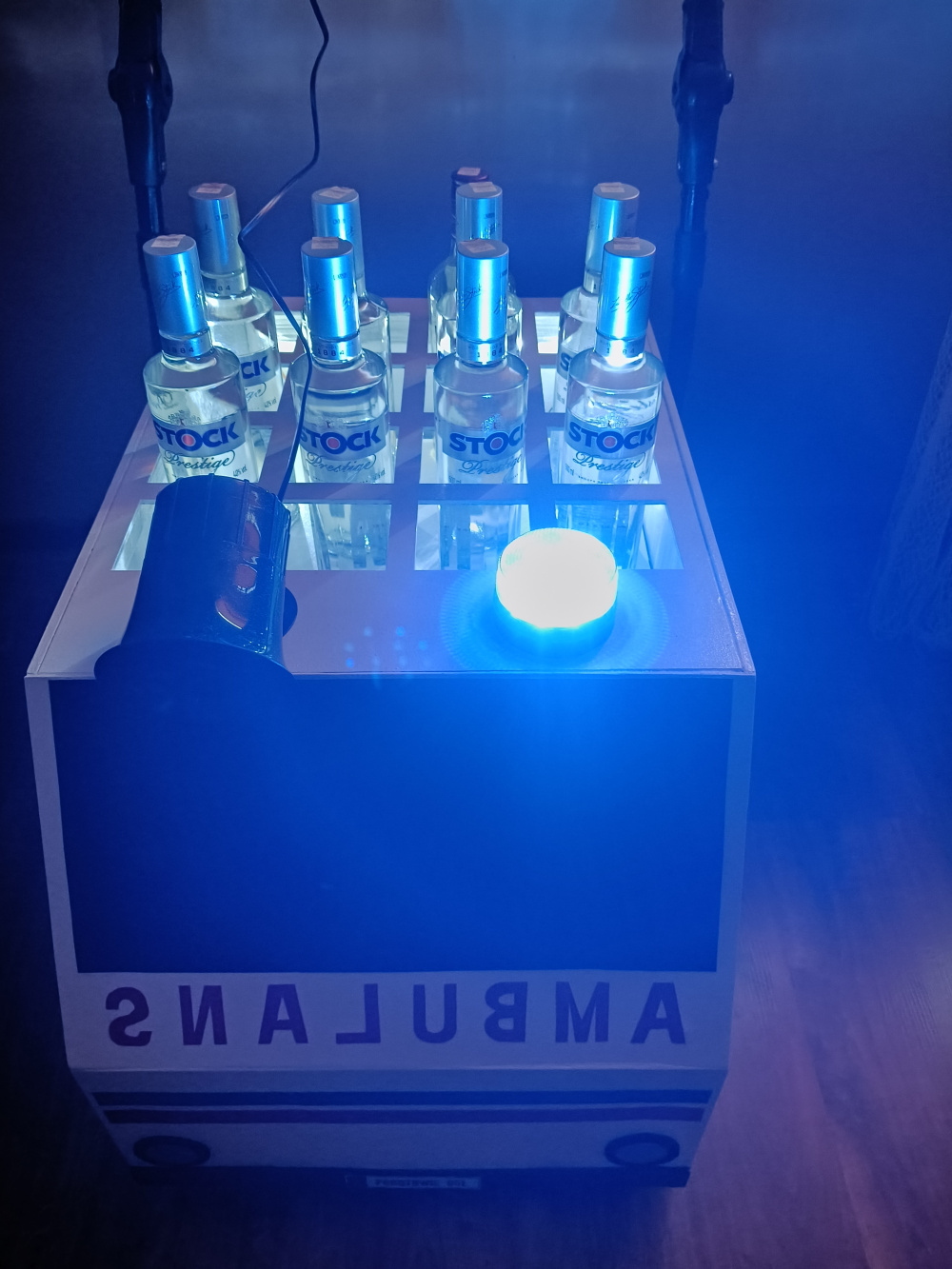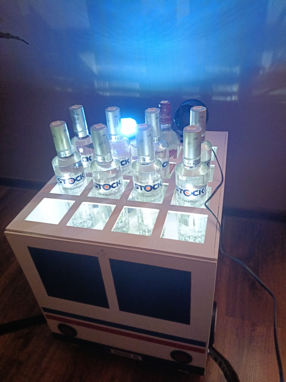 ... (pokaż całość)tlne, co dodatkowo wzmacnia cały efekt, a wszystko jest zasilane z akumulatora. W otworach mieści się 16 butelek wódki 0.5l takich jak: Ogiński, Stock, Biały Bocian itp... oraz niektóre 0.7.