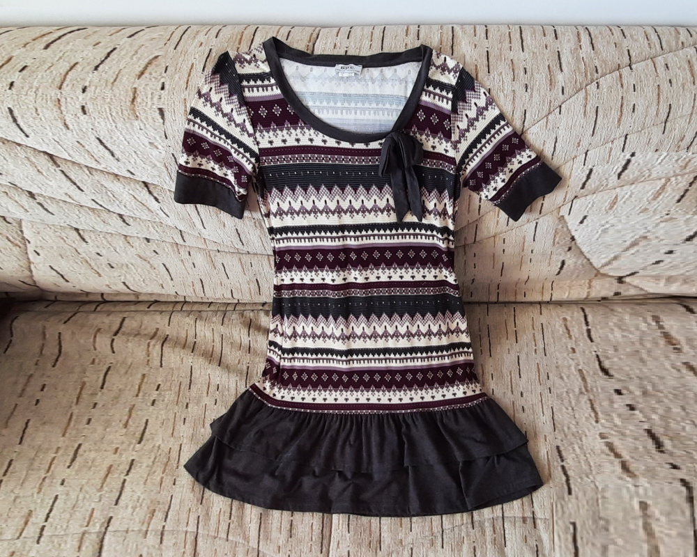 Witam. Sprzedam turecką, bardzo dziewczęcą i uroczą sukienkę, z oryginalnym wzorem i z fajnego materiału; bardzo miła w dotyku, lekko rozciągliwa, rozmiar EU 36-38, wielokolorowa, zakończona dwiema falbanami. Przybliżone wymiary: długość 97 cm, obwód biustu 90/92 cm, krótki rękaw (długość z mankietem 29 cm). Stan bardzo dobry (zdjęcia), jak nowa. Sukienka przewiewna, pięknie układa się na sylwetc