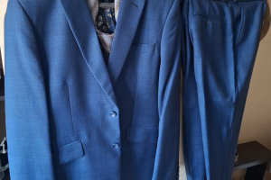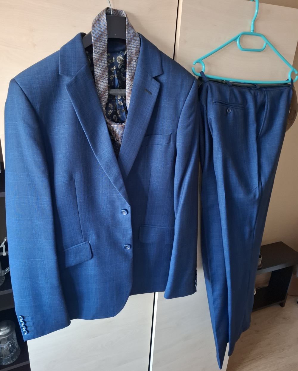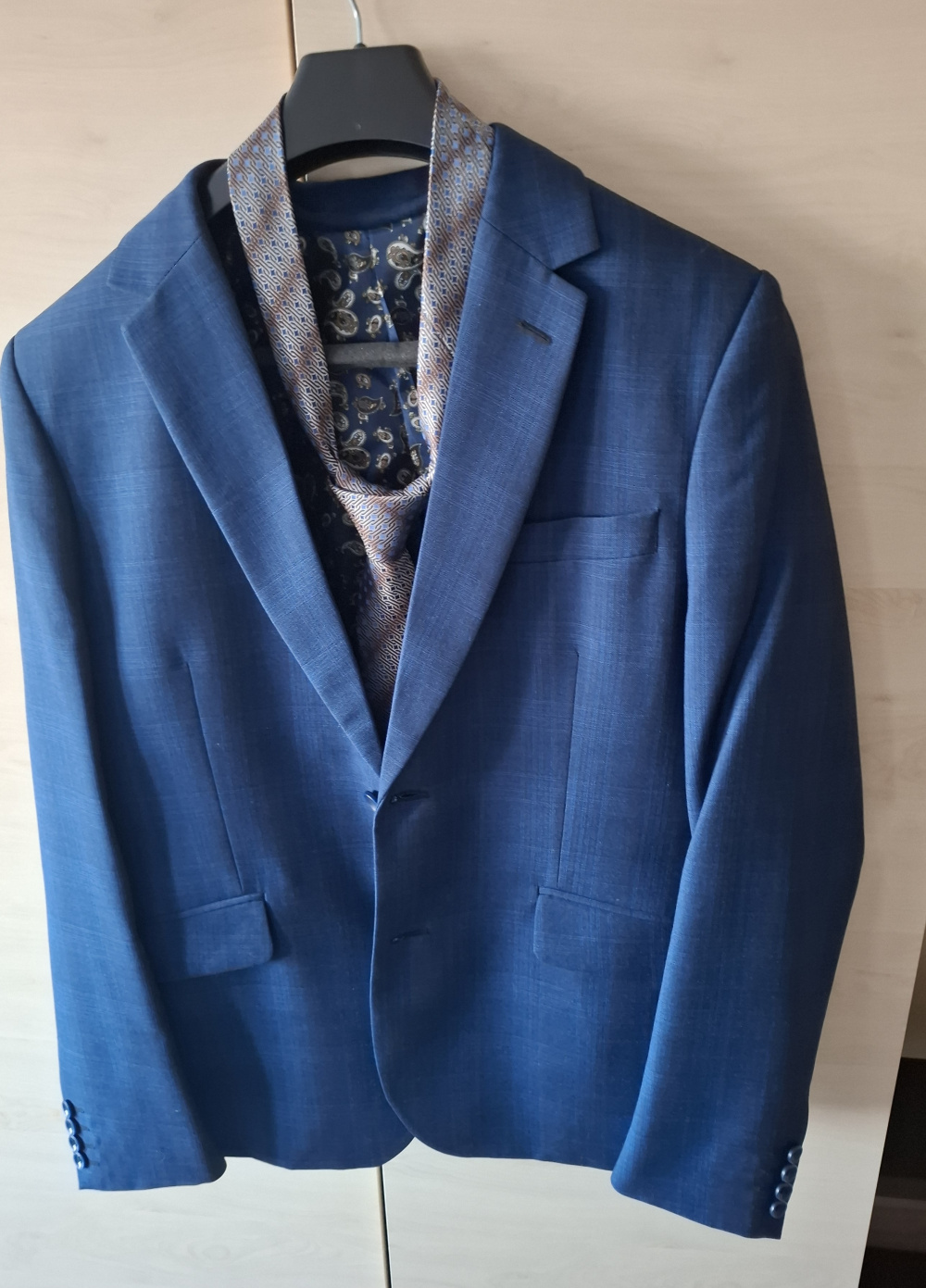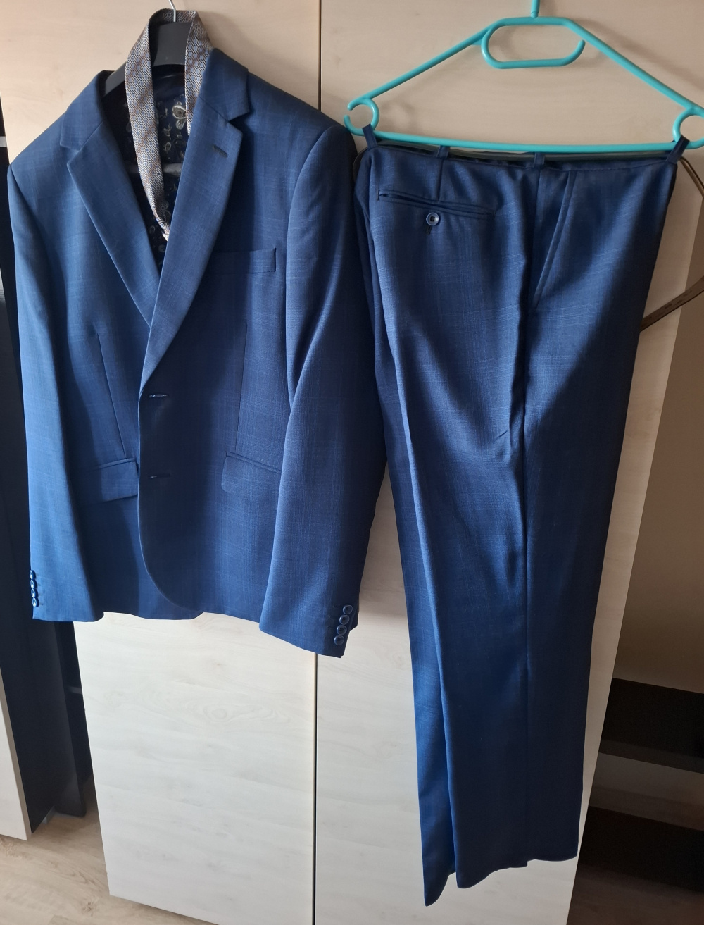 Cena 40 zł. Kolor granatowy wpadający w czarny, wełniana z 5% domieszką, na 182 cm wzrostu (182 / 96 / 82). Marynarka: długość rękawa ok. 69 cm, zapinana na 3 guziki, w klapie butonierka, kieszonka na poszetkę, dwie kieszenie zewnętrzne z patkami, wewnątrz 4 kieszenie. Całość na doskonałej jakości podszewce. Zakupi