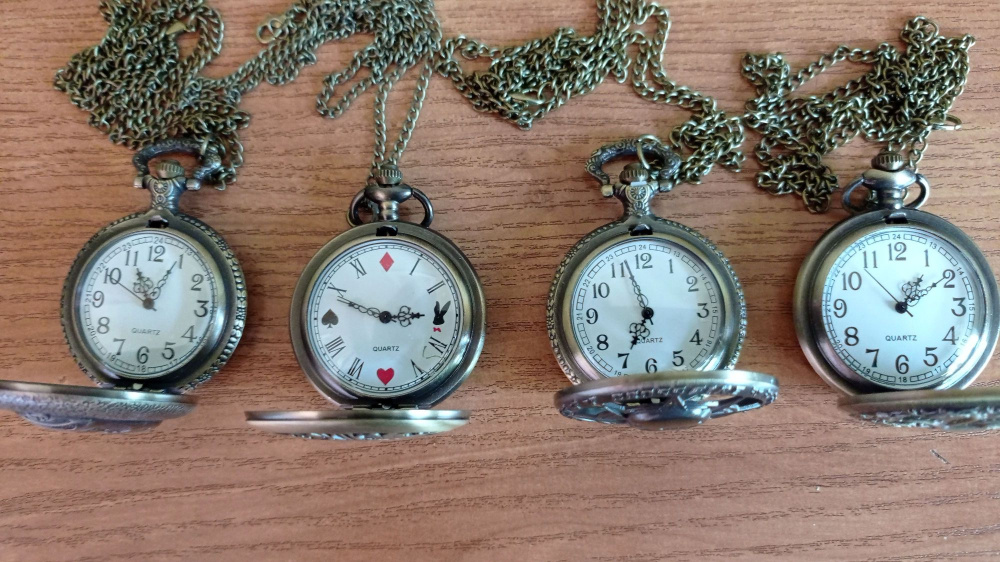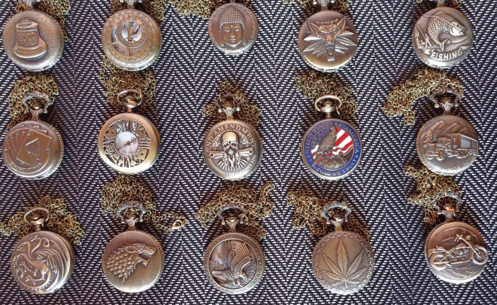 Do sprzedania (tylko całość!) komplet-kolekcja 15 sztuk nowych, nie używanych pięknych męskich kwarcowych zegarków kieszonkowych z łańcuszkami, które mogą też służyć za wisiorek.
