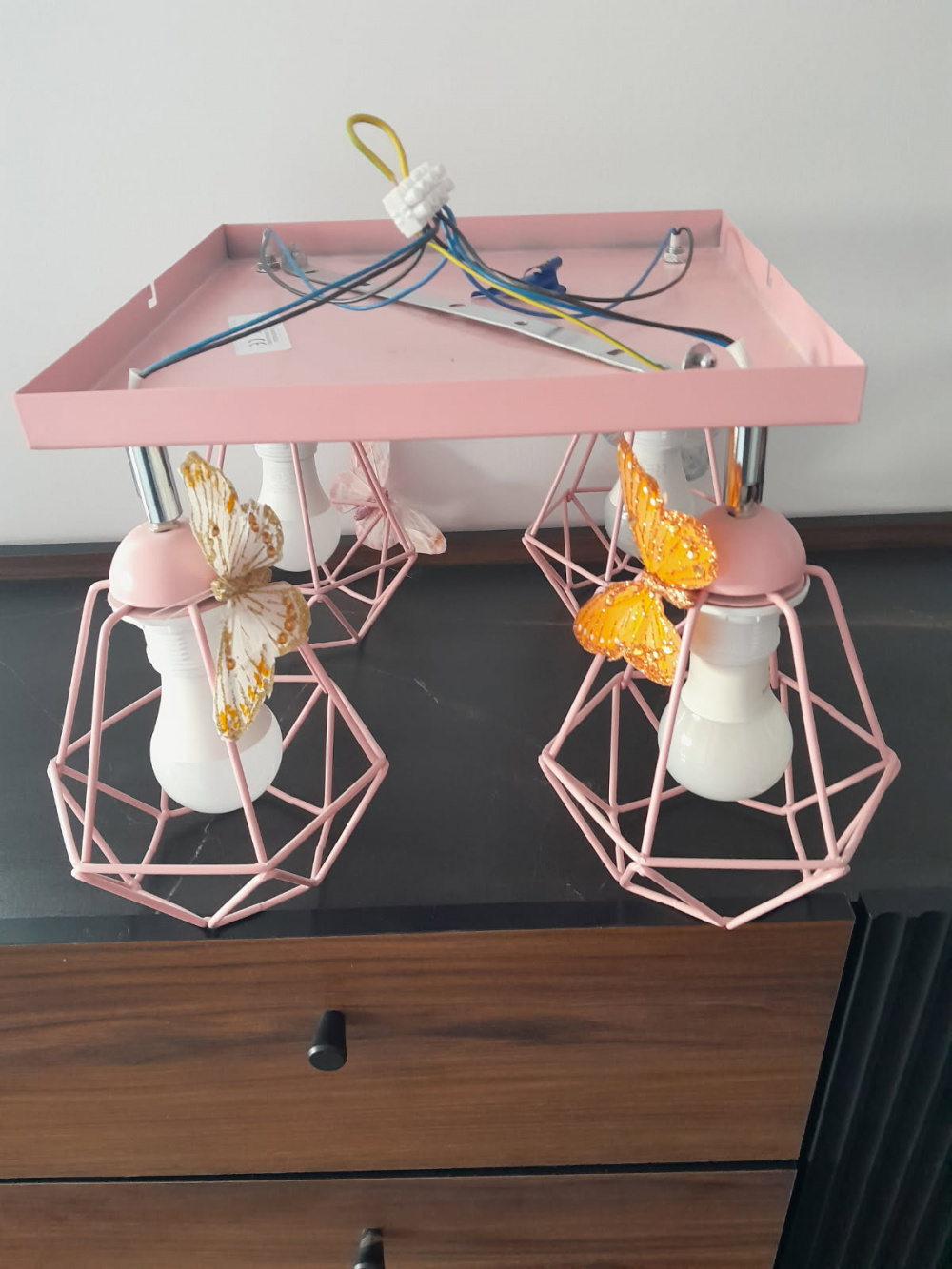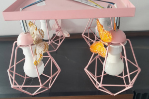 Sprzedam metalową lampę sufitową w kolorze pastelowego różu do pokoju dziewczynki. Dodatkową ozdobą lampy jest 4 sztuki eleganckich motyli. Motyle posiadają magnes, dzięki czemu można je umieszczać w dowolnym miejscu na lampie. Stan idealny.