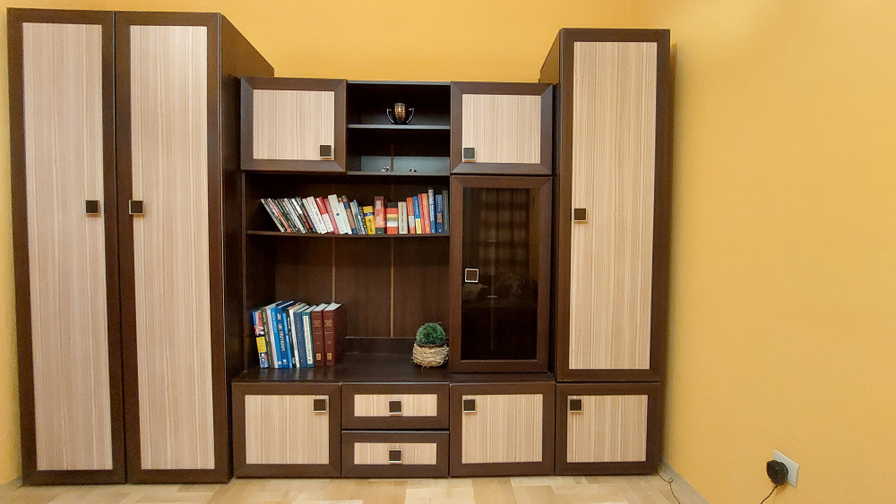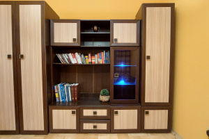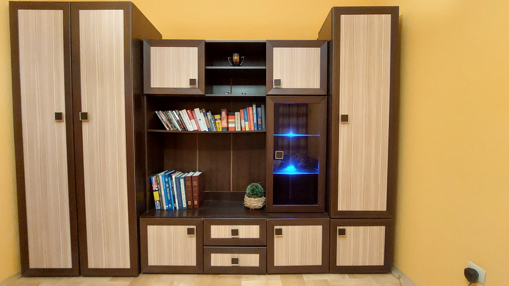 Meble młodzieżowe składające się z trzech segmentów o wymiarach [szer. x wys.]: 1. szafa - 0,9 m x 2,1 m, 2. witryna podświetlana - 1,5 m x 1,9 m, 3. szafka - 0,5 m x 2,1 m. Łączny wymiar mebli 2,9 m.