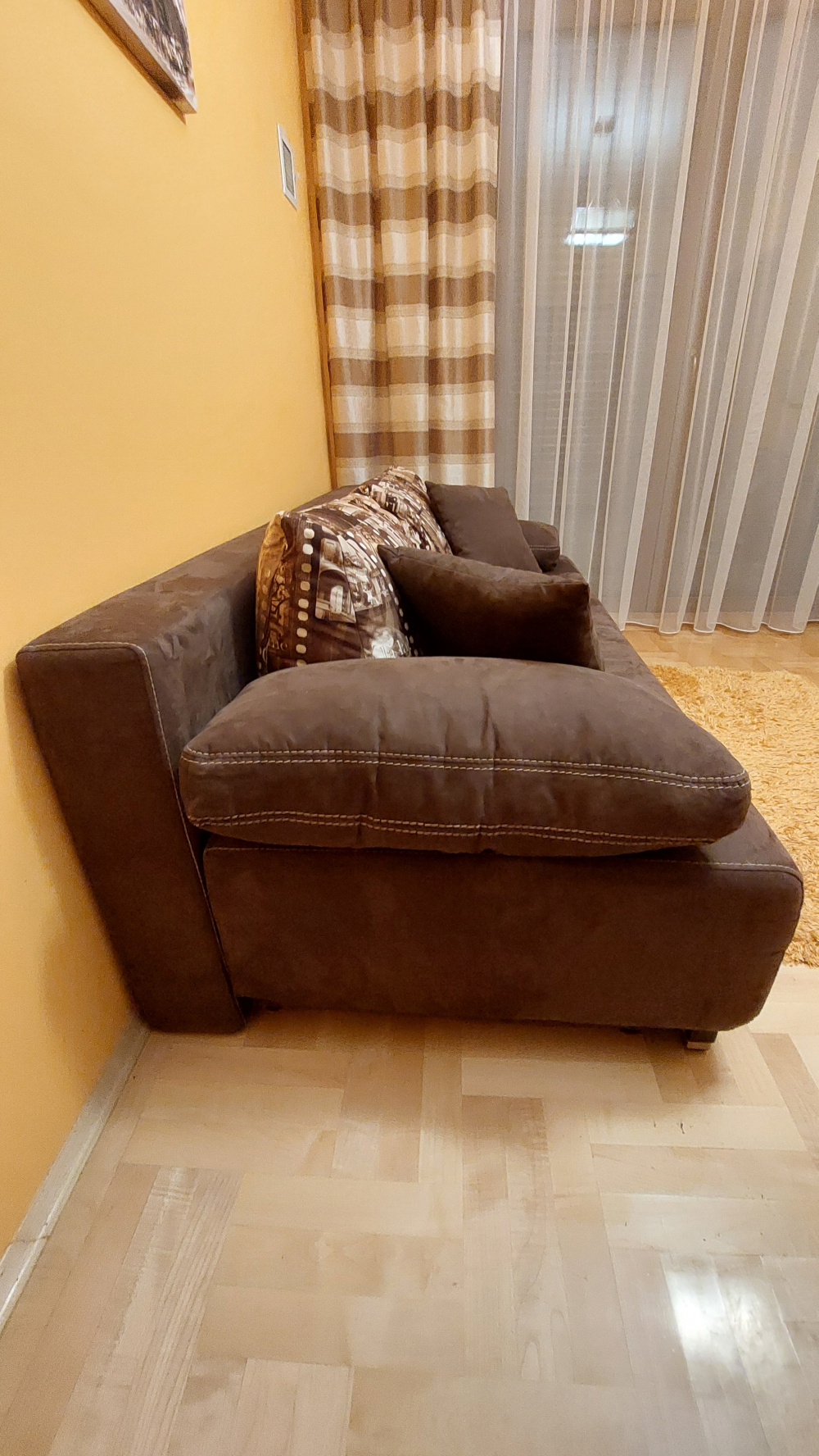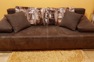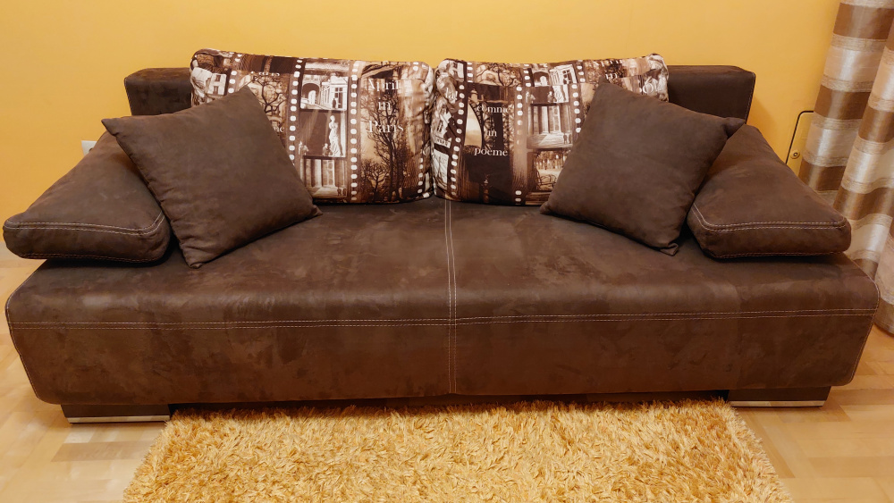 Łóżko rozkładane o wymiarach: - szerokość (głębokość) 1,0 m, - długość 2,0 m, - szerokość spania, łóżko złożone 0,7 m, - szerokość spania, łóżko rozłożone 1,5 m. Obicie - materiał, brąz.