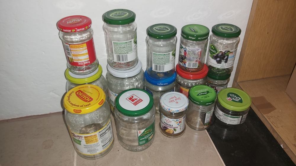 Słoiki widoczne na zdjęciu ponad 80 sztuk różnej wielkości na przetwory zamienię na płyn do prania bialy jelen uniwersalny litrowy i butelkę dobrego słodkiego wina.