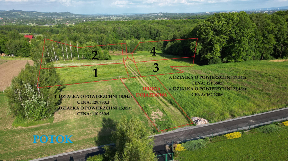 Kształt i ukształtowanie terenu: działki o kształtach regularnych i nieregularnych, lekko nachylone, co zapewnia naturalne odprowadzenie wody i atrakcyjne widoki na okoliczne wzgórza.
