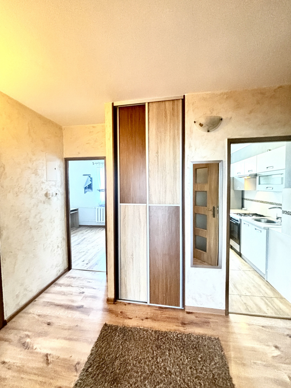 W mieszkaniu ściany gładzone, na podłodze w pokoju parkiet. Okno drewniane, w bardzo dobrym stanie technicznym.